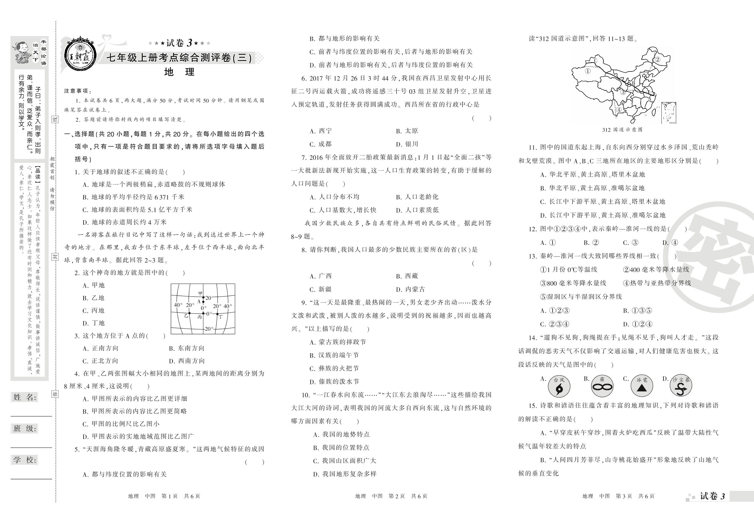 王朝霞期末测评卷——考点综合测评卷(三)七年级上册地理(中图版)【3】