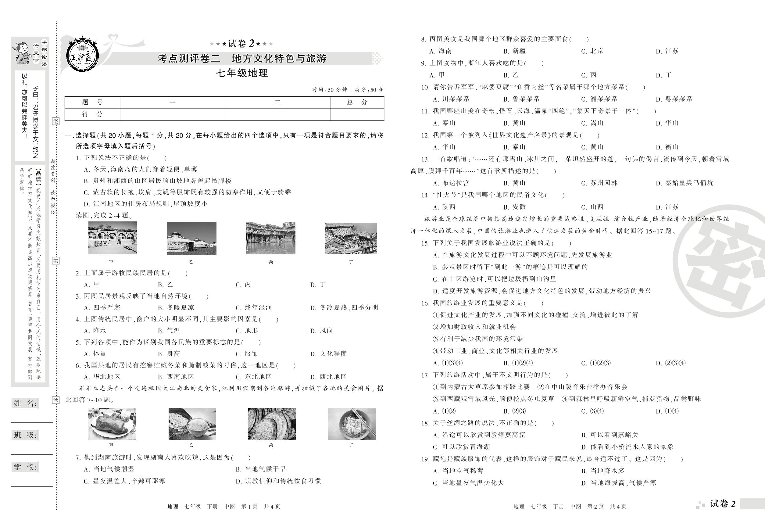 王朝霞期末测评卷——考点测评卷二 地方文化特色与旅游七年级下册地理(中图版)【2】