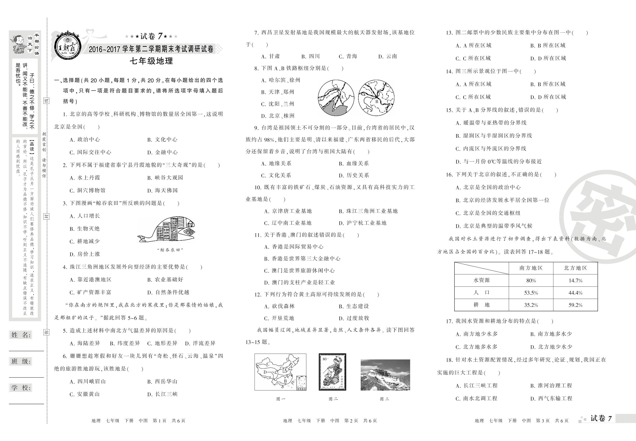 2016-2017学年第二学期期末考试调研试卷七年级地理(中图版)【7】