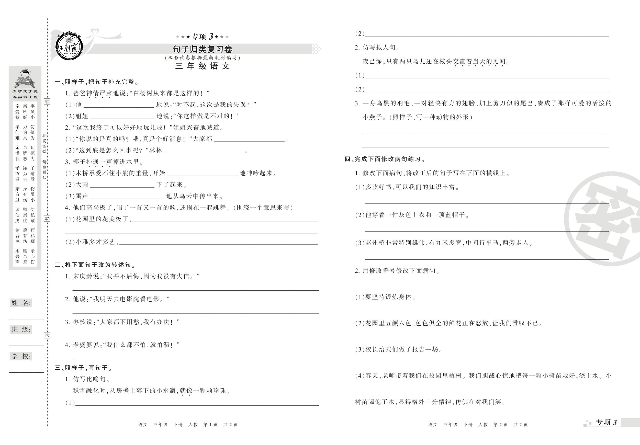 王朝霞期末专项卷——句子、课文内容归类复习三年级下册语文(人教版)【0】