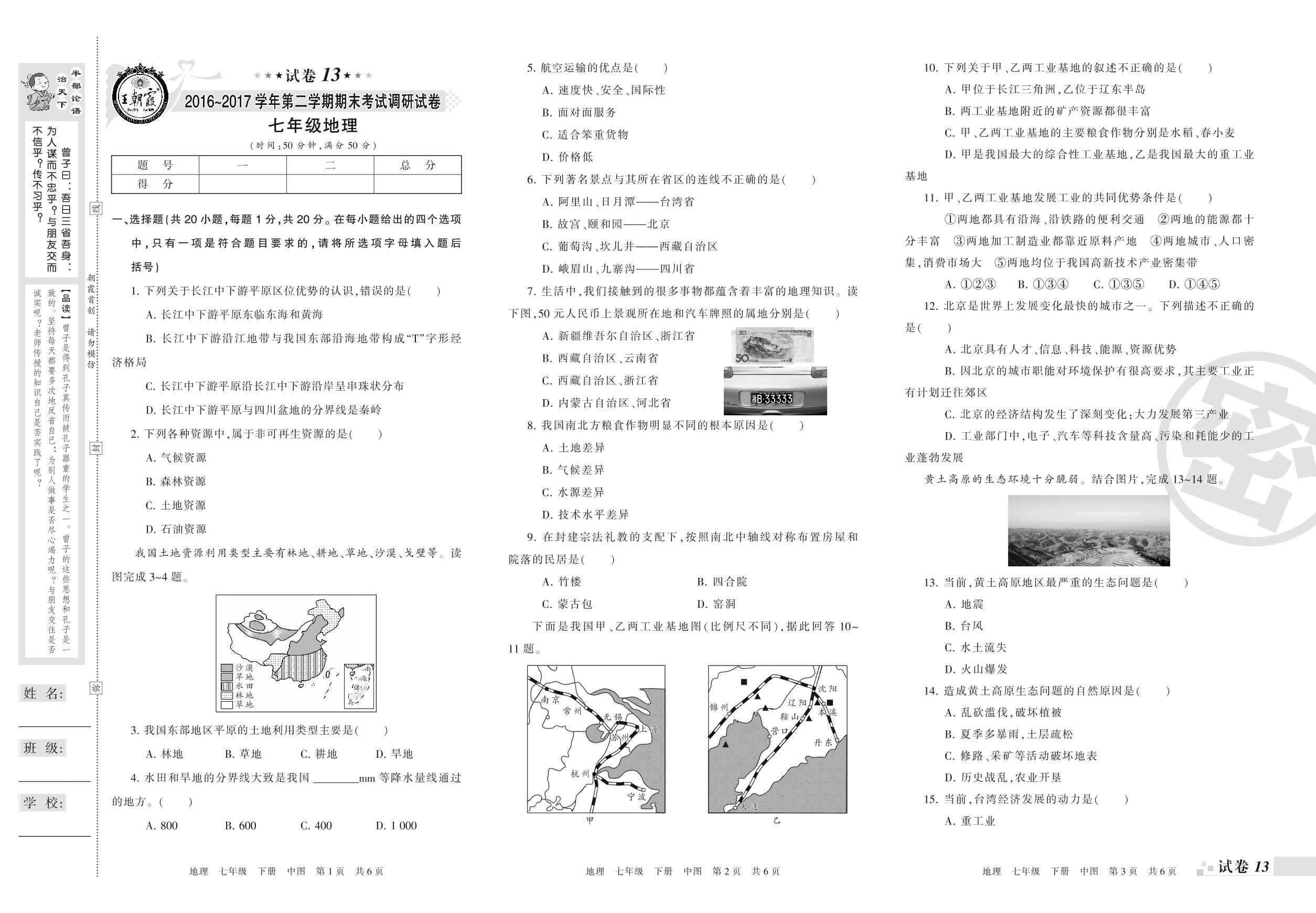 2016-2017学年第二学期期末考试调研试卷七年级地理(中图版)【13】