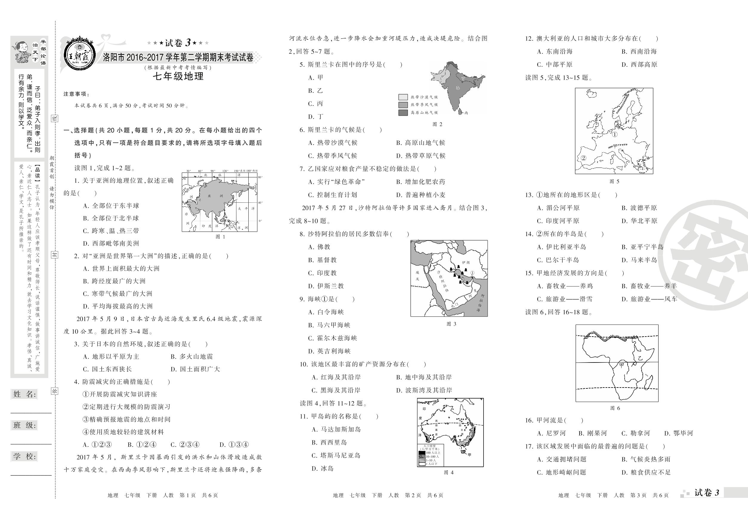 2016-2017学年第二学期洛阳市七年级地理试卷(人教版)【3】