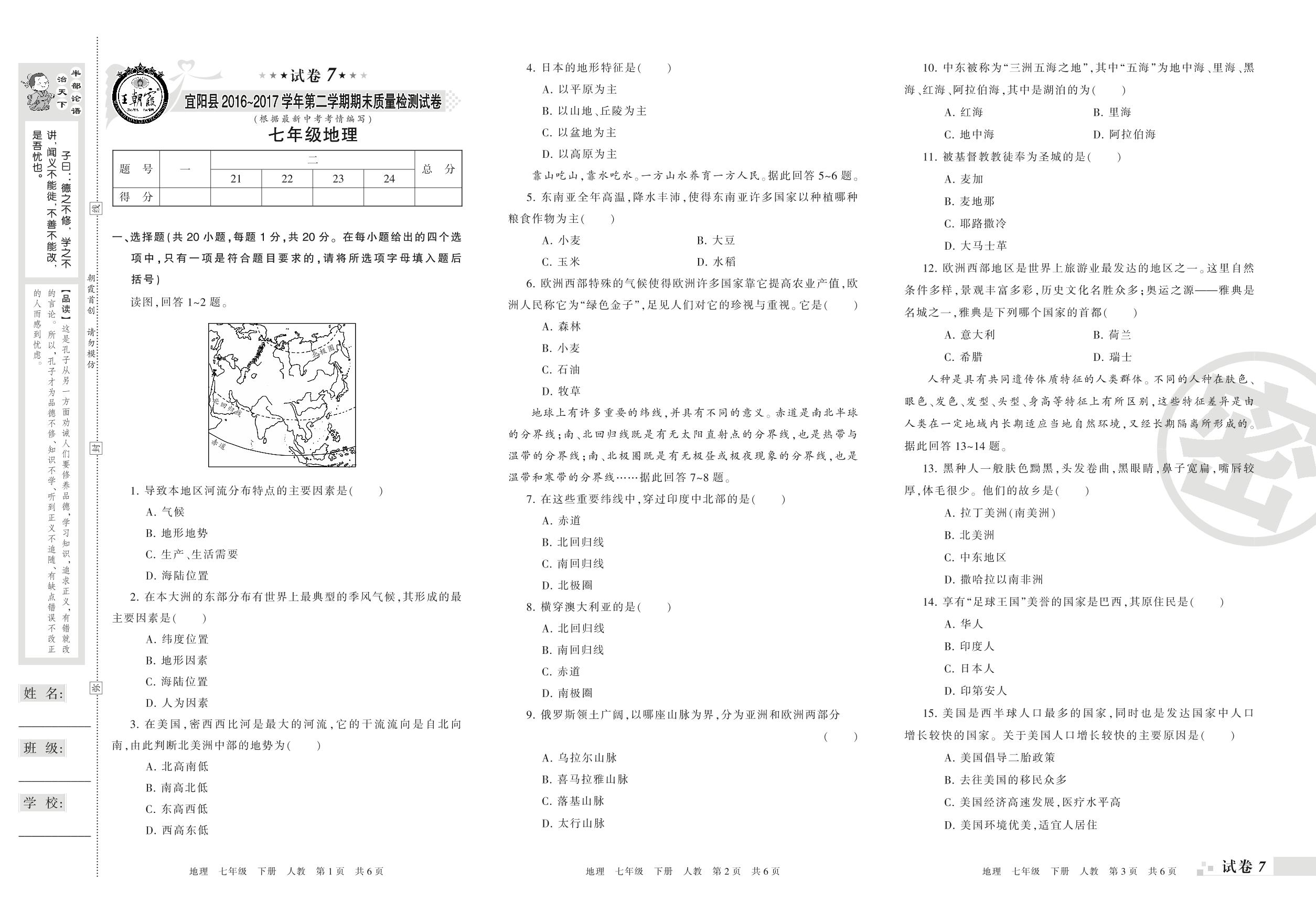 2016-2017学年第二学期洛阳市宜阳县七年级地理试卷(人教版)【7】