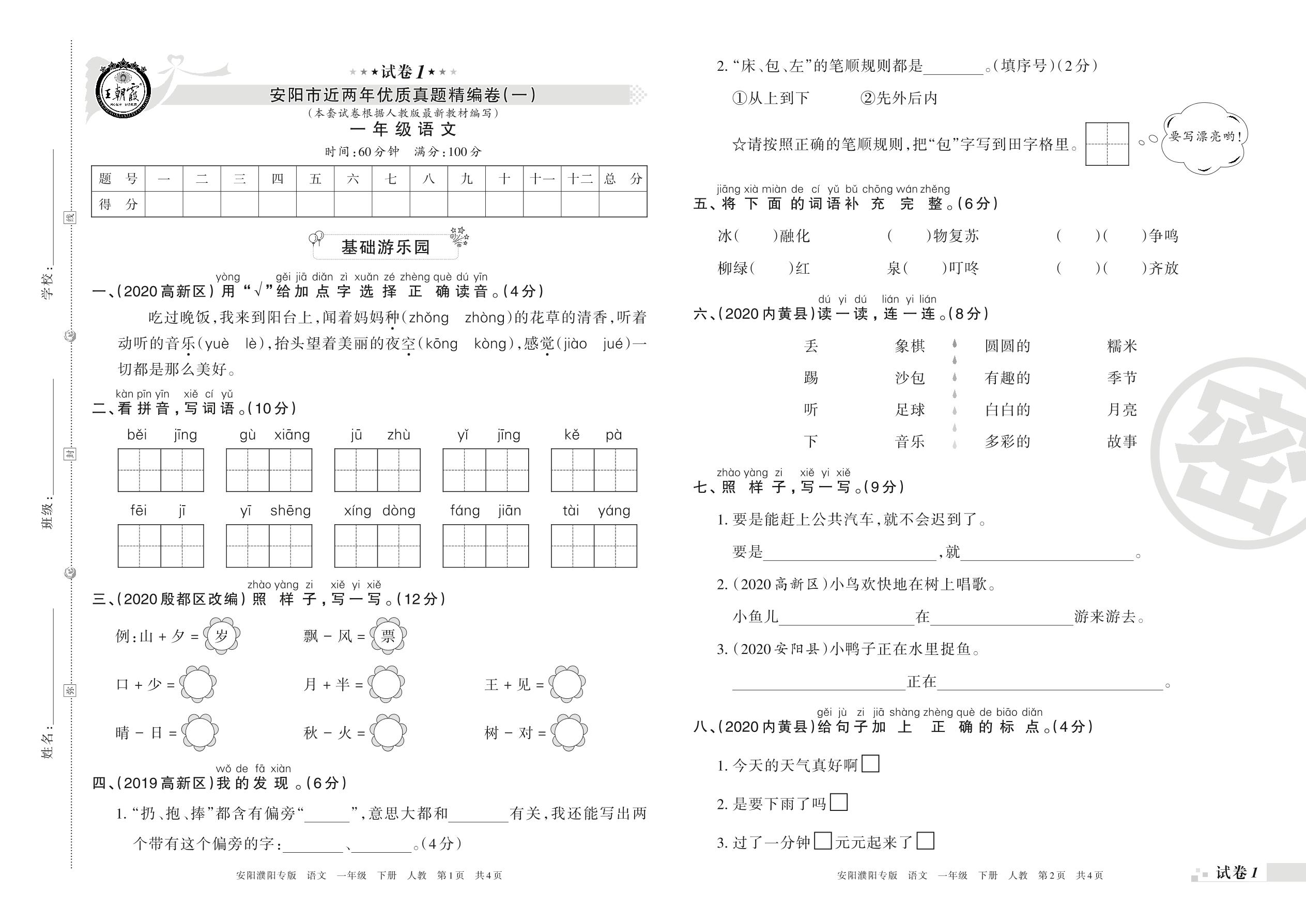 安阳市近两年优质真题精编卷(一)一年级下册语文(人教版)【1】
