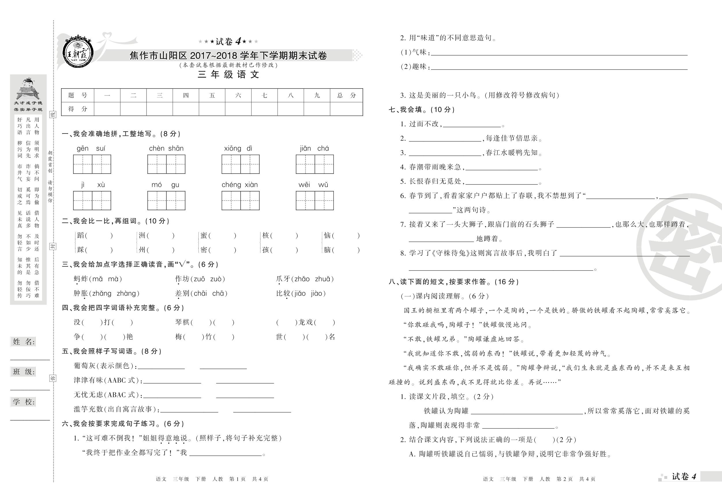 2017-2018学年第二学期焦作市山阳区三年级语文试卷(人教版)【4】