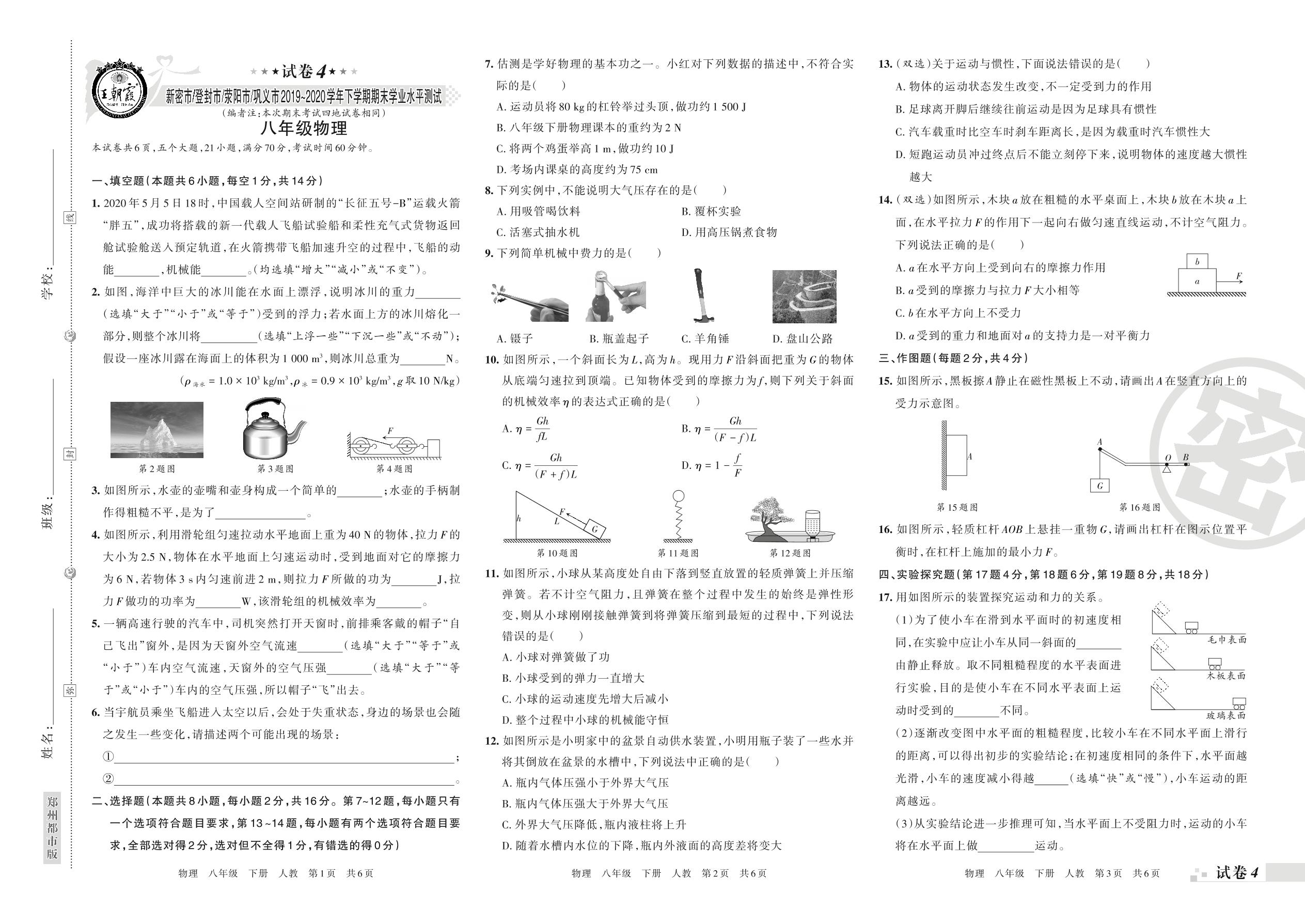 2019-2020学年第二学期新密市、登封市、荥阳市、巩义市八年级物理试卷(人教版)【4】