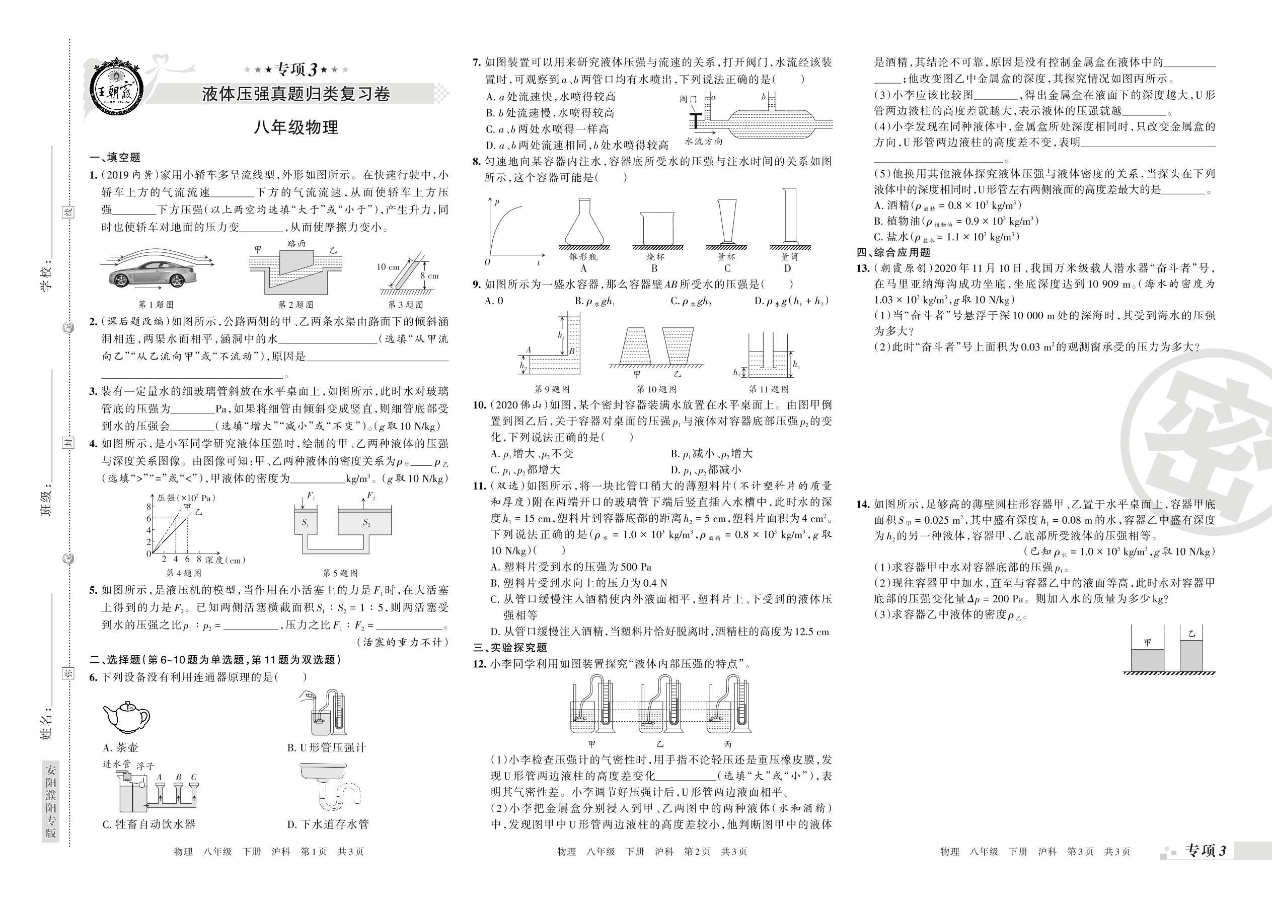 王朝霞期末专项卷——液体压强、浮力真题归类复习八年级下册物理(沪科版)【0】