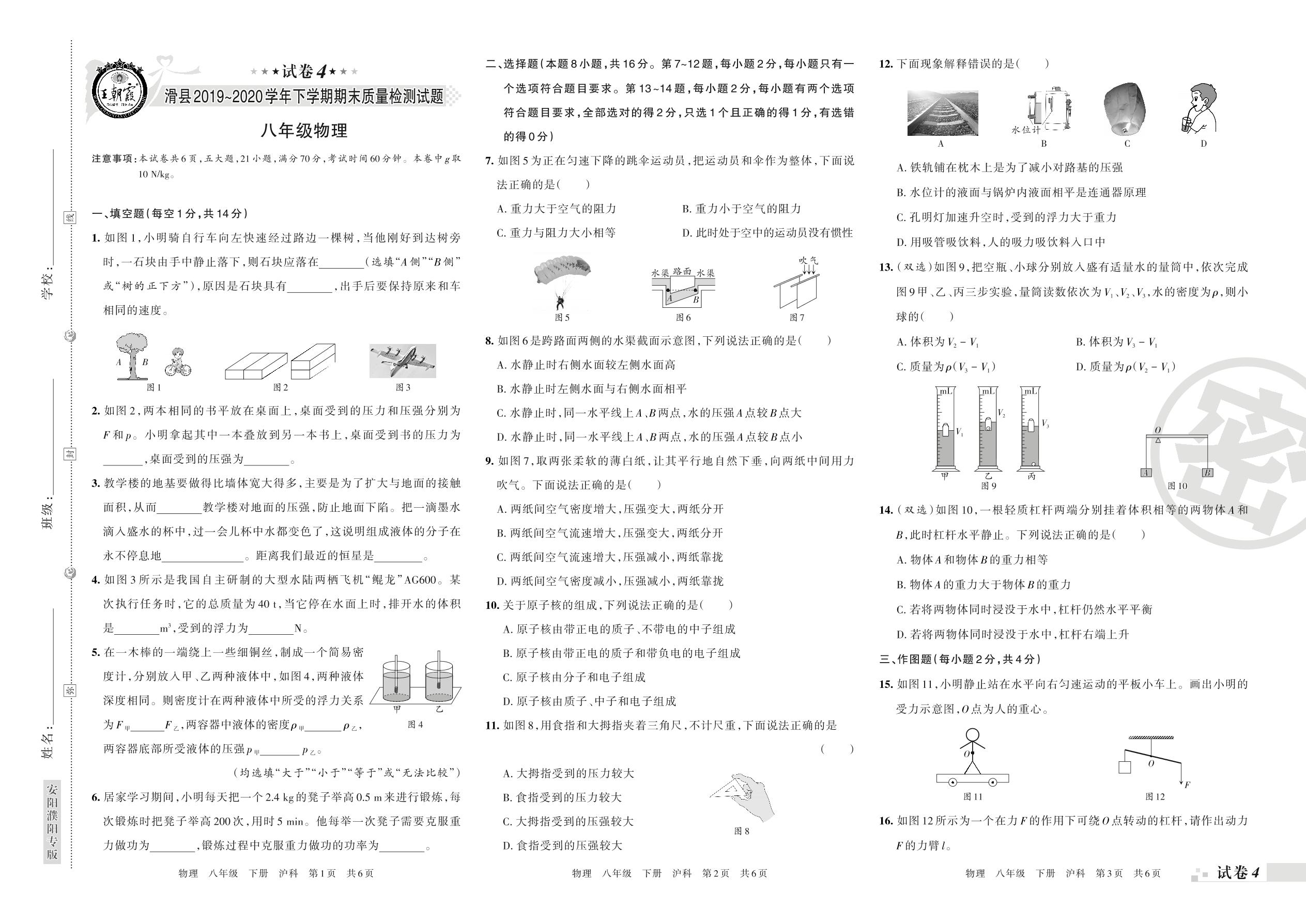 2019-2020学年第二学期安阳市滑县八年级物理试卷(沪科版)【4】