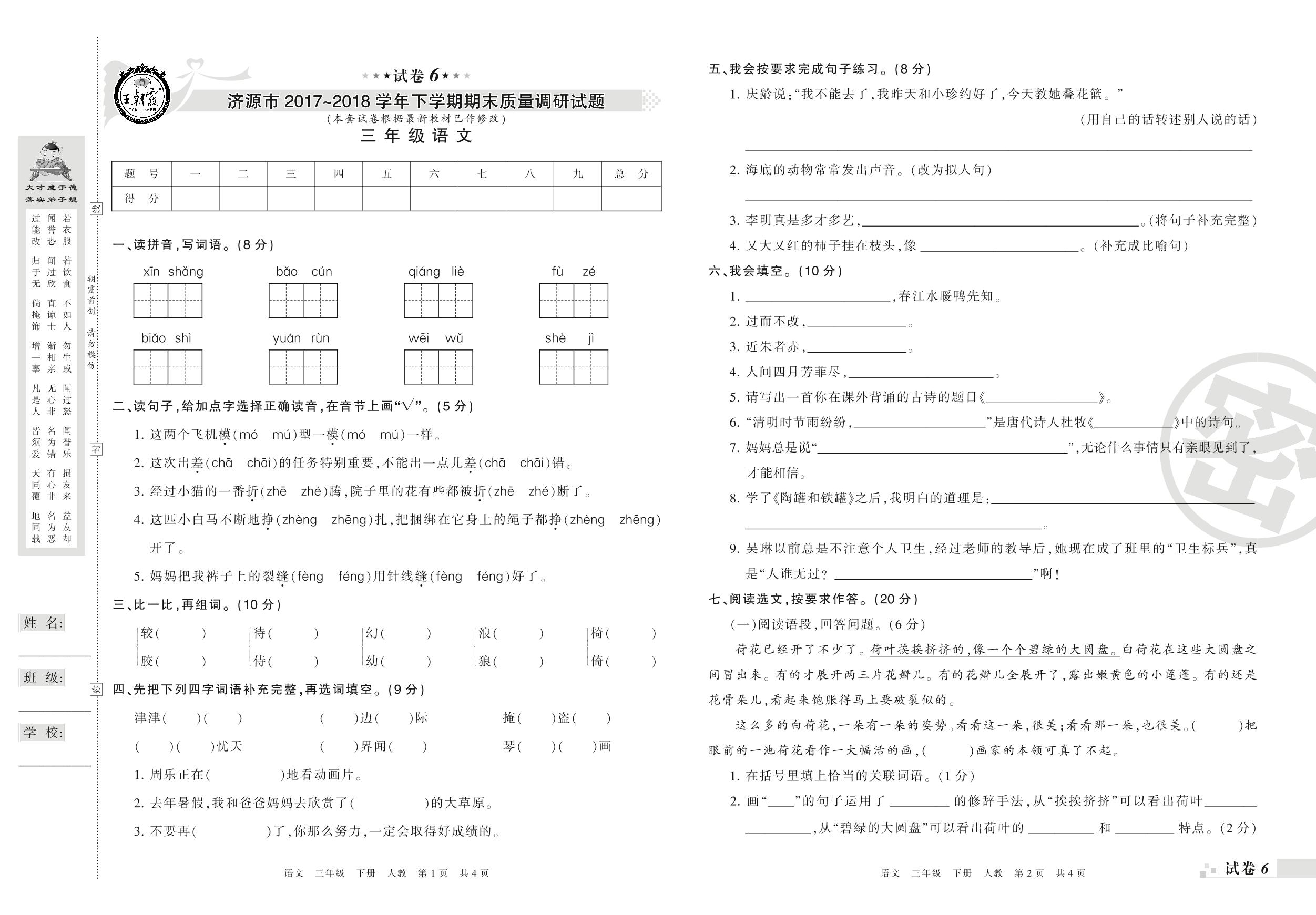 2017-2018学年第二学期济源市三年级语文试卷(人教版)【6】