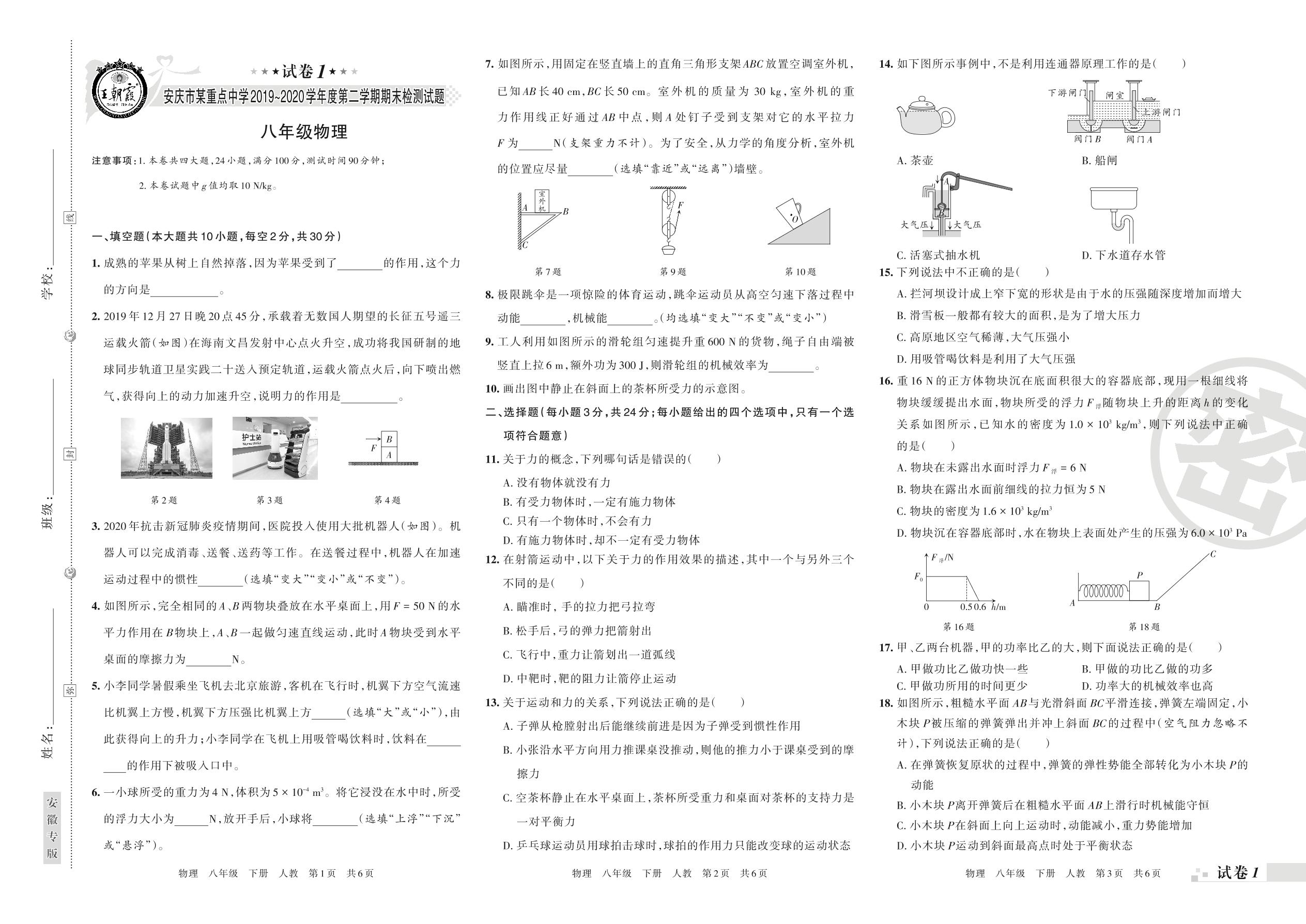 2019-2020学年第二学期安庆市某重点中学八年级物理试卷(人教版)【1】