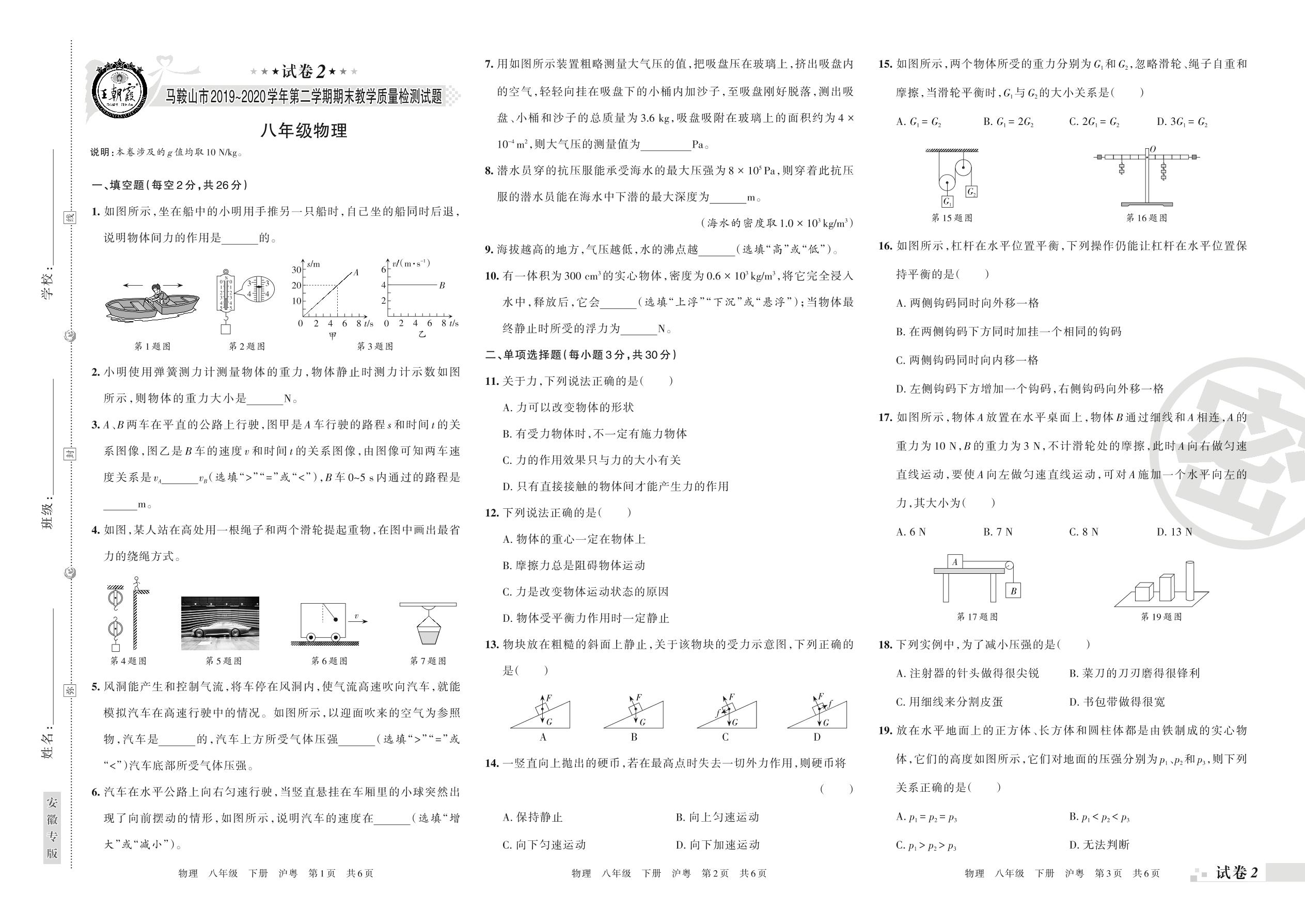 2019-2020学年第二学期马鞍山市八年级物理试卷(沪粤版)【2】