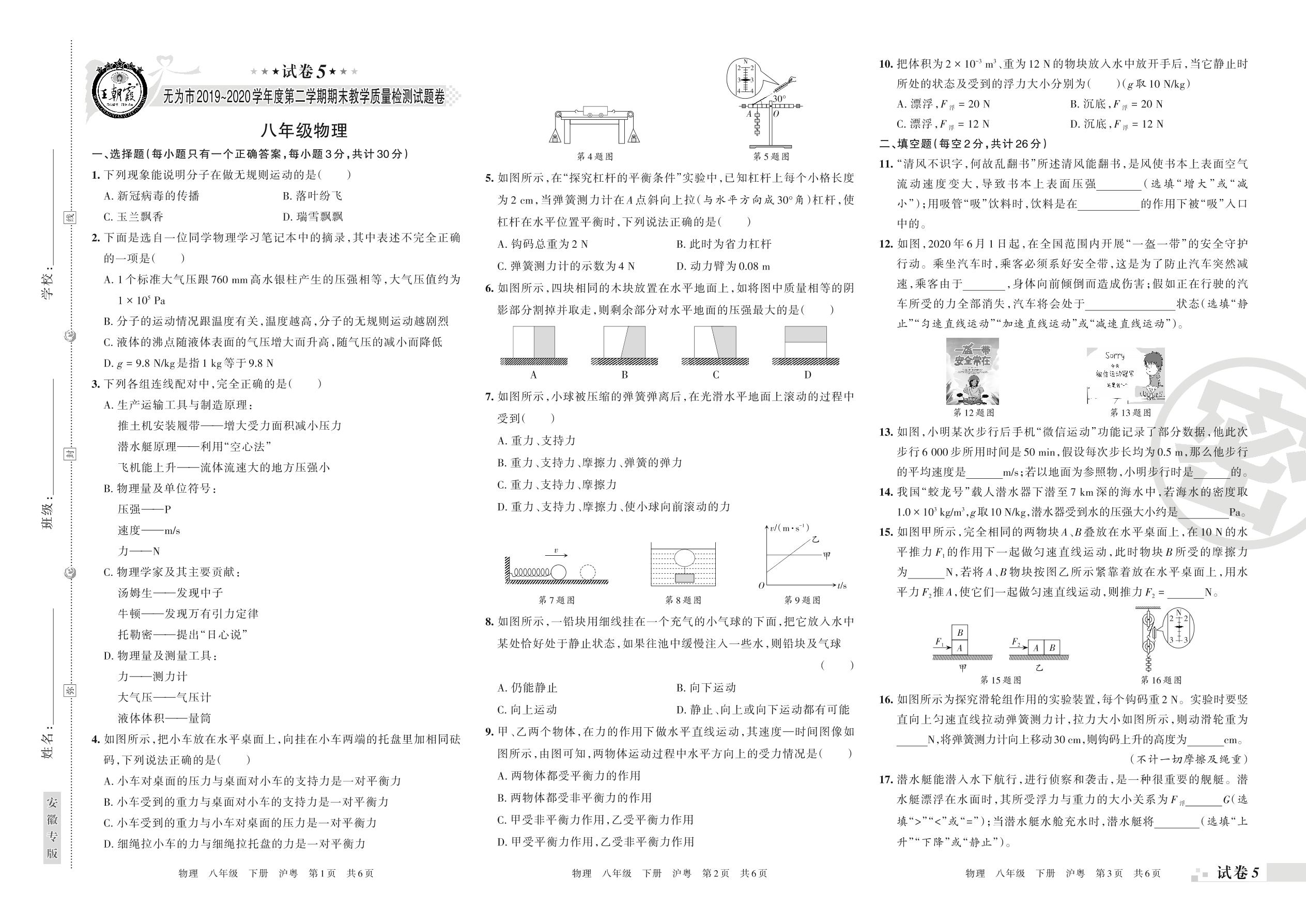 2019-2020学年第二学期无为市八年级物理试卷(沪粤版)【5】