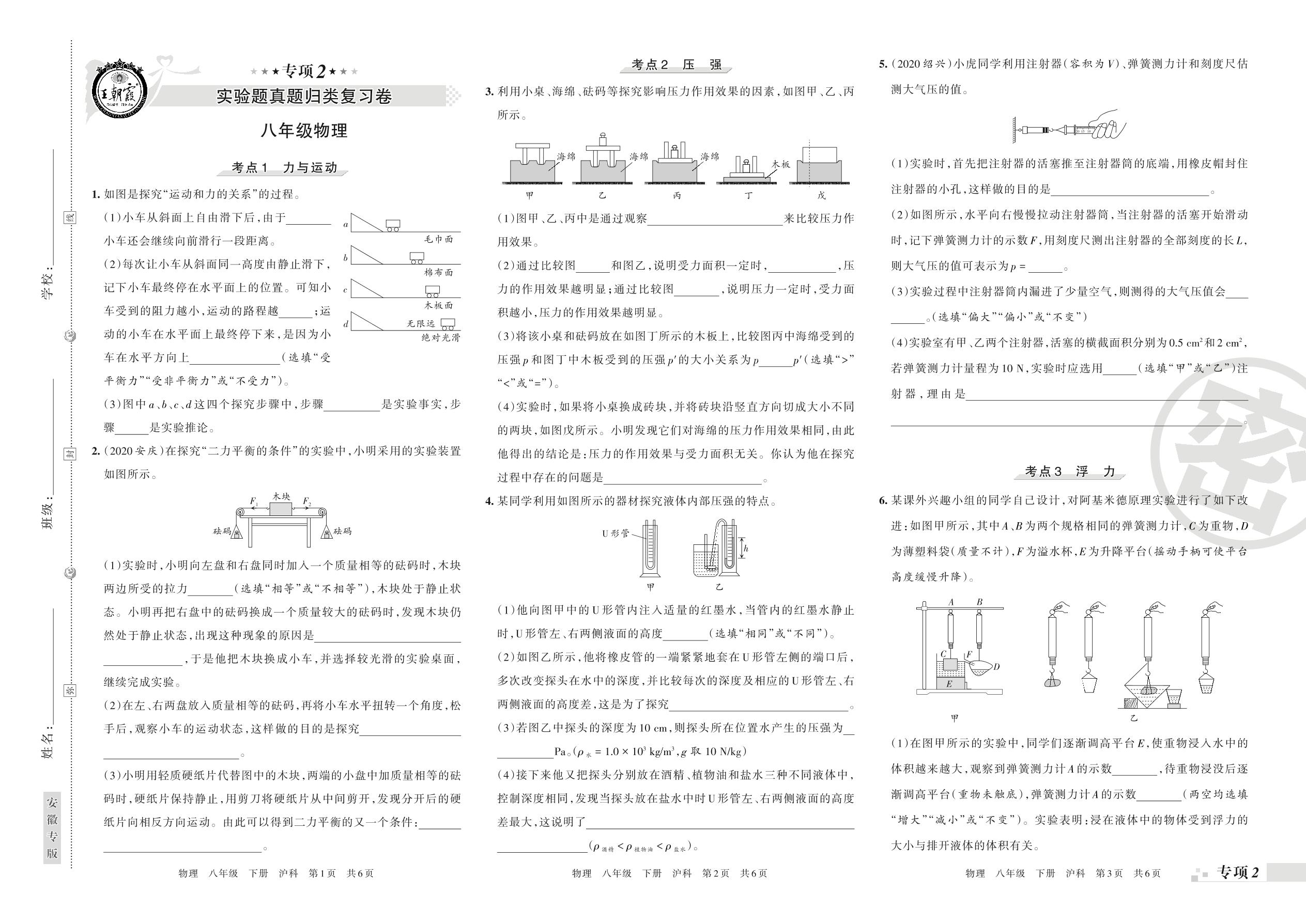 王朝霞期末专项卷——实验题真题归类复习八年级下册物理(沪科版)【0】