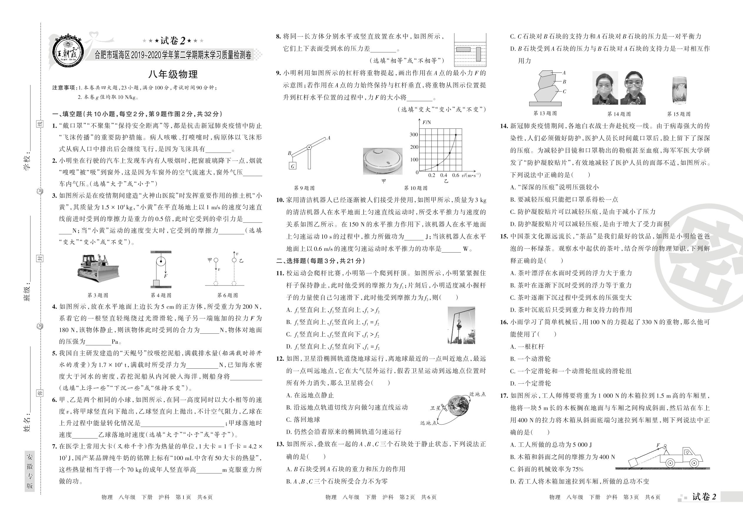 2019-2020学年第二学期合肥市瑶海区八年级物理试卷(沪科版)【2】