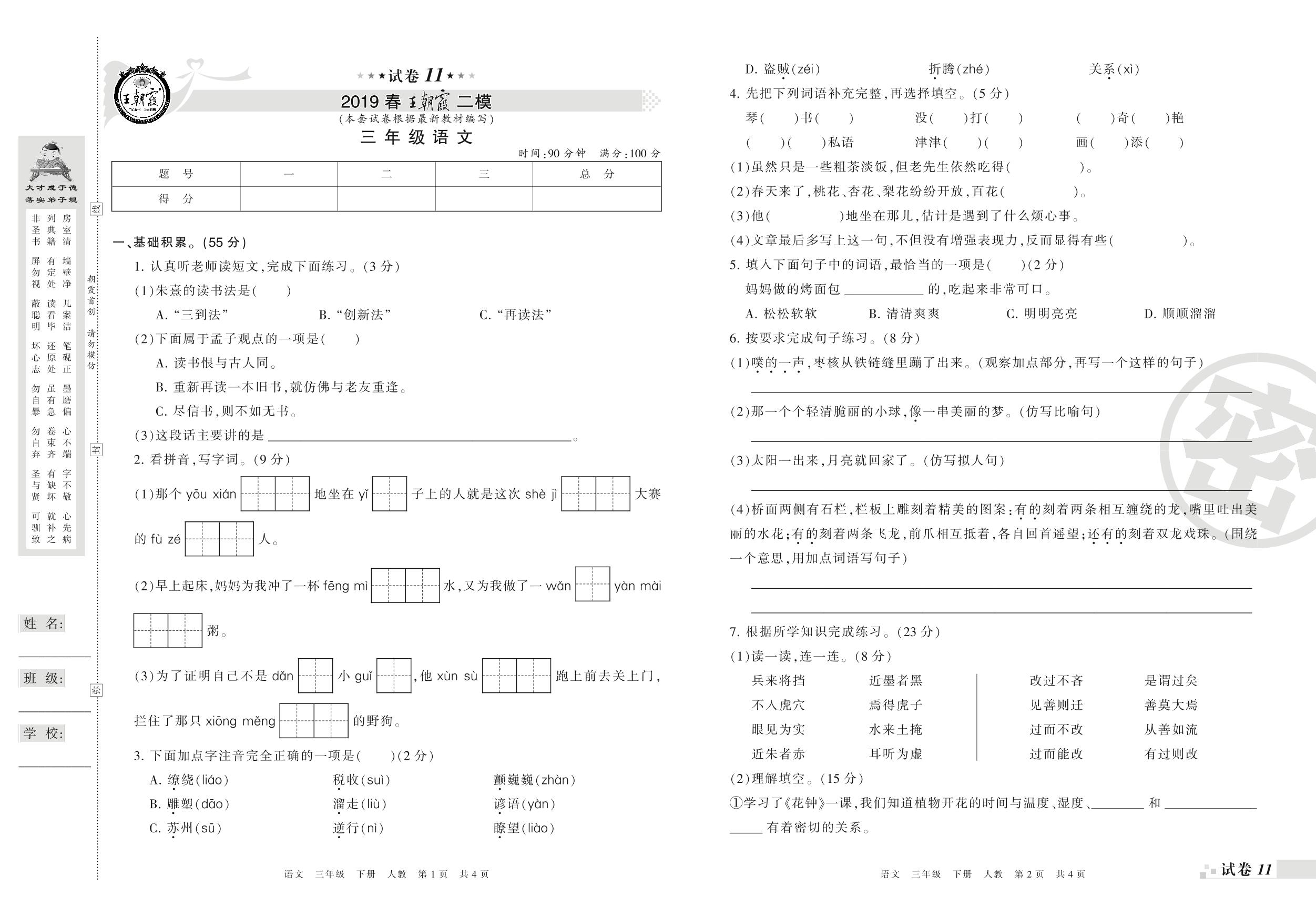 王朝霞期末模拟卷三年级下册语文(人教版)_R21080193128【11】