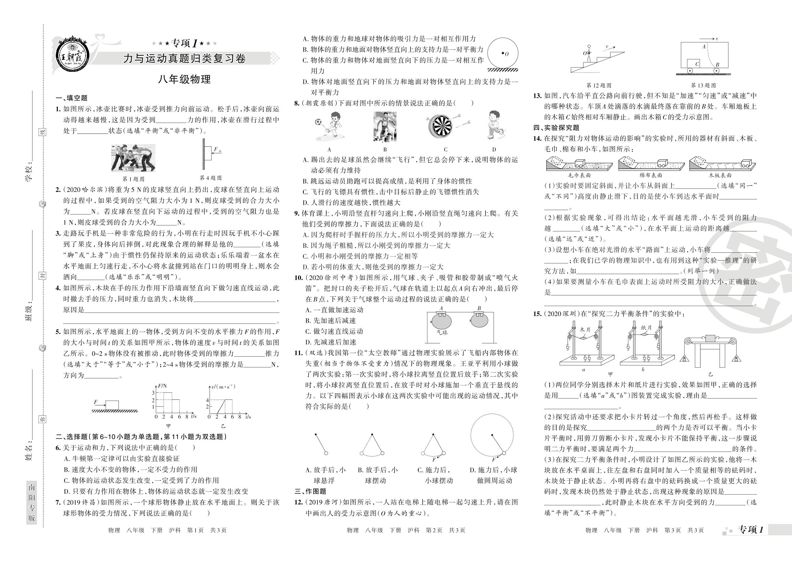 王朝霞期末专项卷——力与运动、固体压强与大气压强真题归类复习八年级下册物理(沪科版)【0】