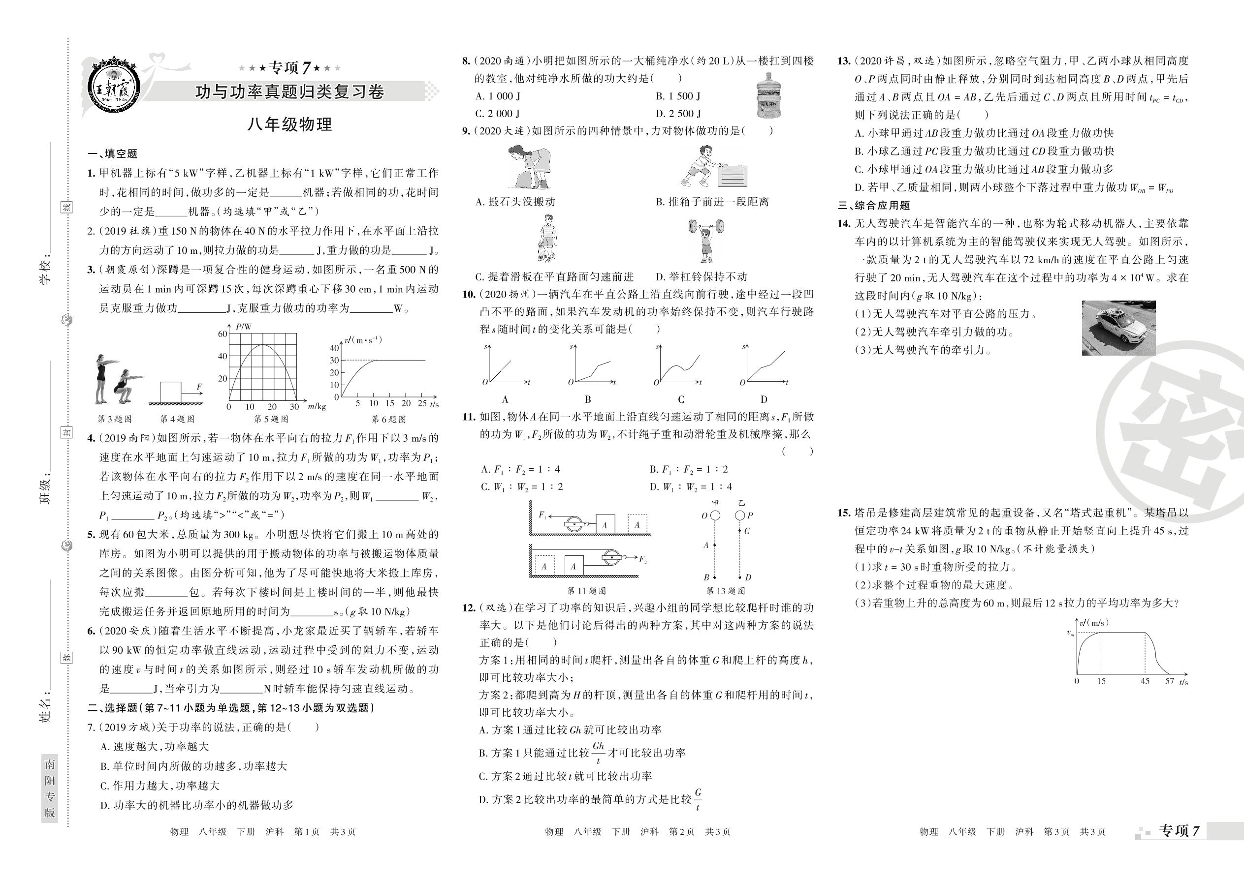 王朝霞期末专项卷——功与功率、机械效率与机械能真题归类复习八年级下册物理(沪科版)【0】
