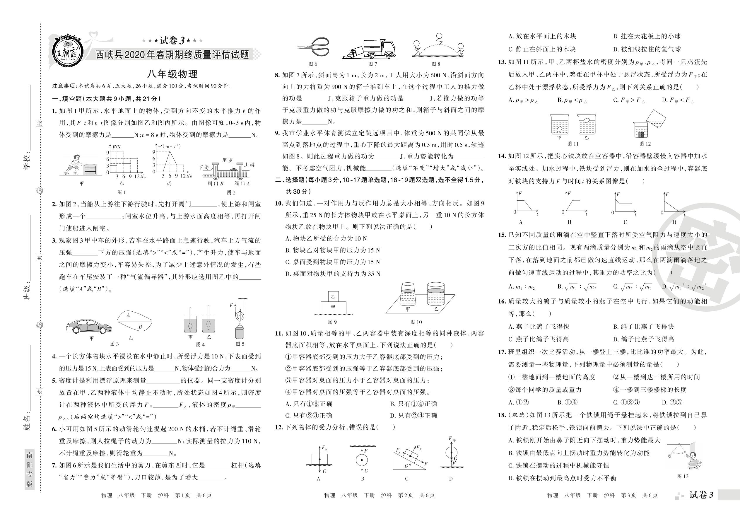 2019-2020学年第二学期南阳市西峡县八年级物理试卷(沪科版)【3】