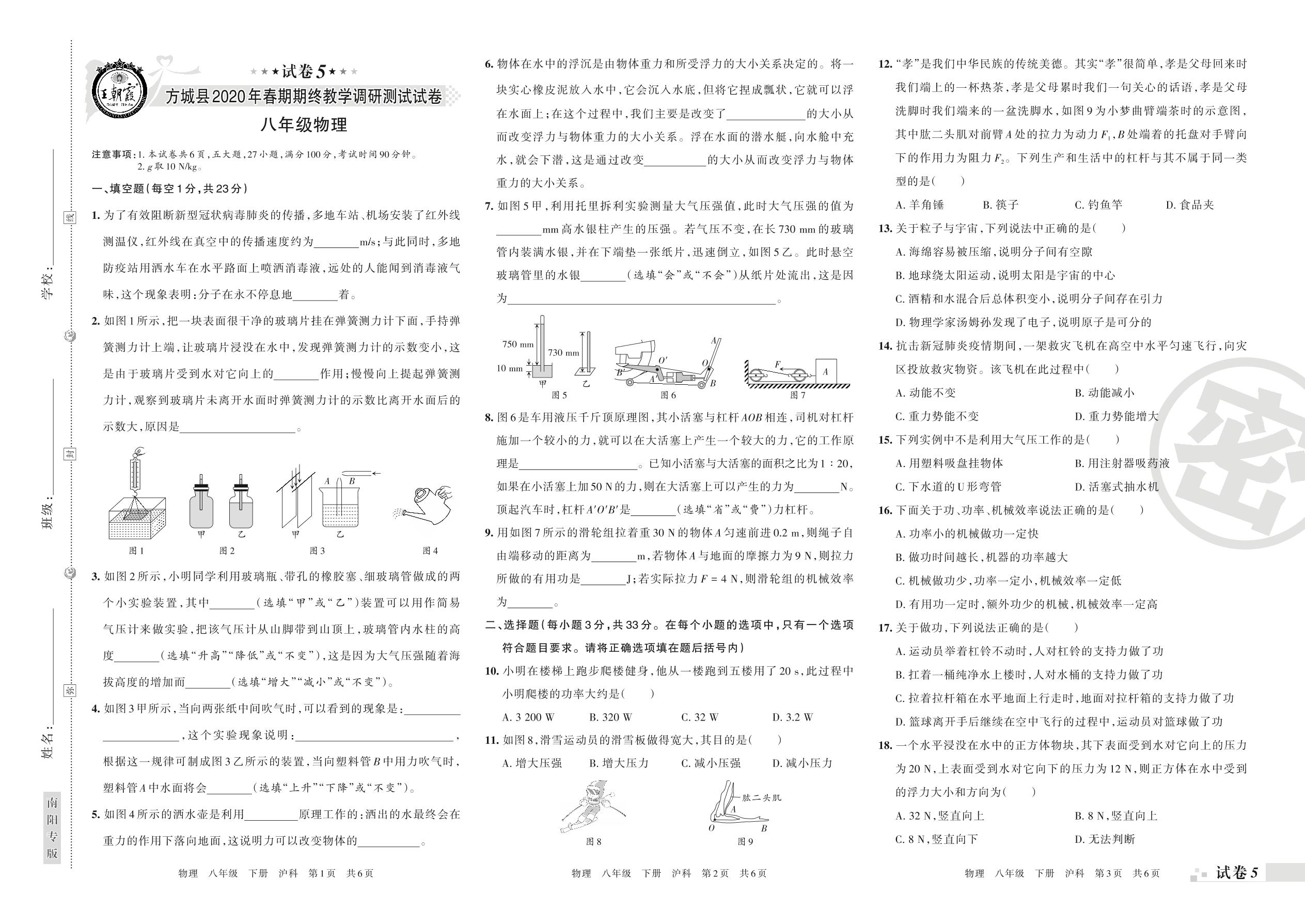 2019-2020学年第二学期南阳市方城县八年级物理试卷(沪科版)【5】