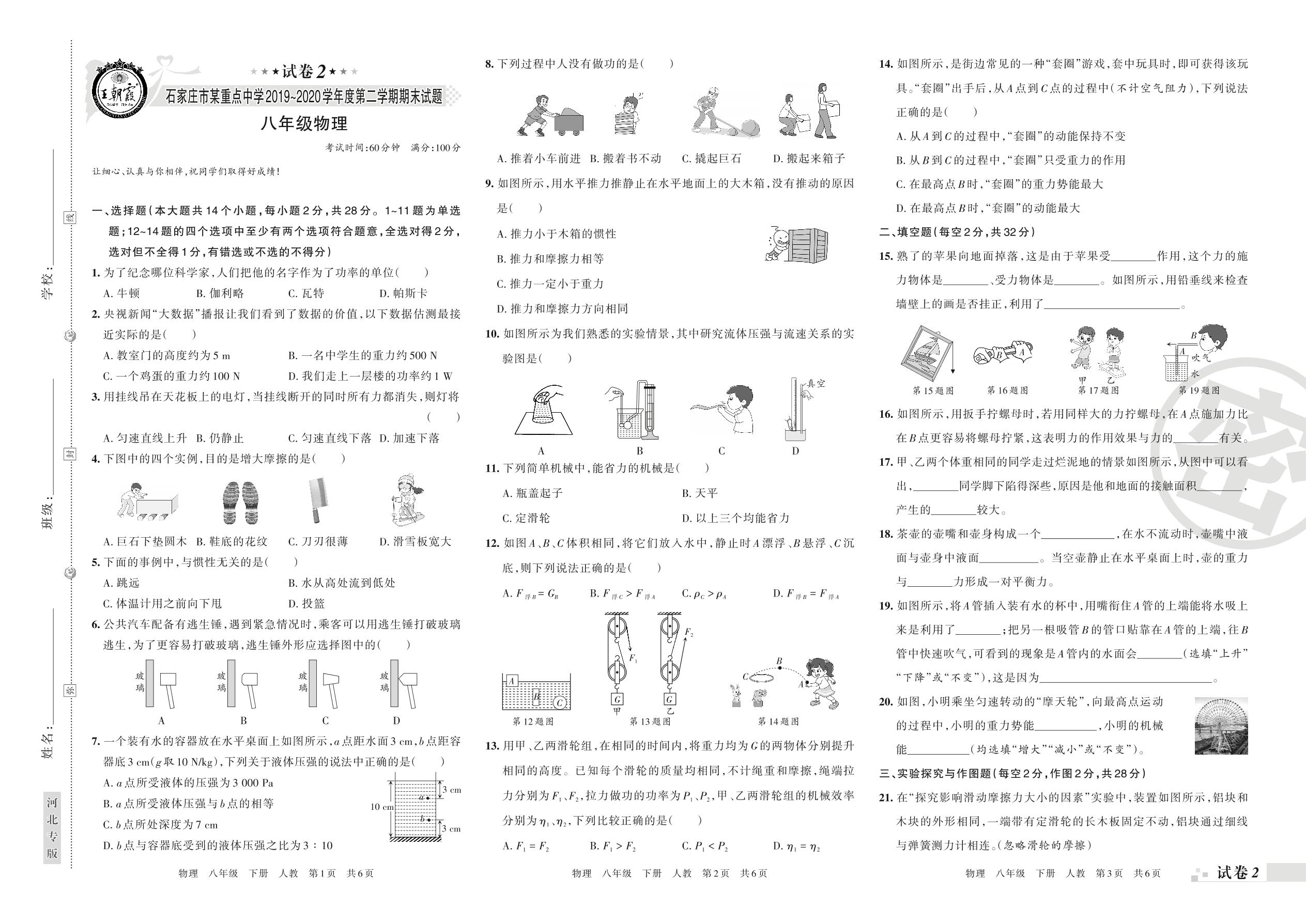 2019-2020学年第二学期石家庄市八年级物理试卷(人教版)【2】