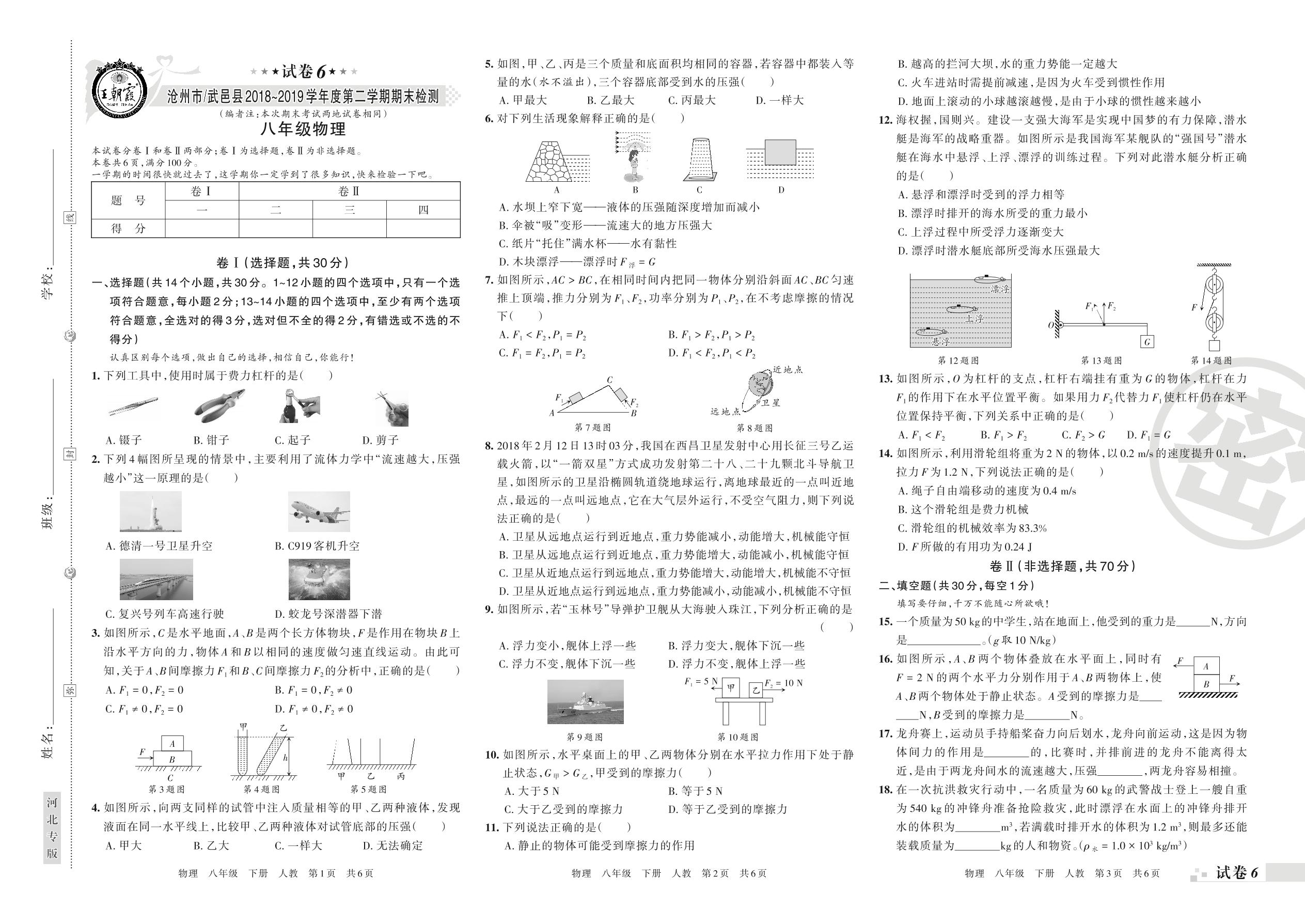 2018-2019学年第二学期沧州市、武邑县八年级物理试卷(人教版)_R210810155956【6】