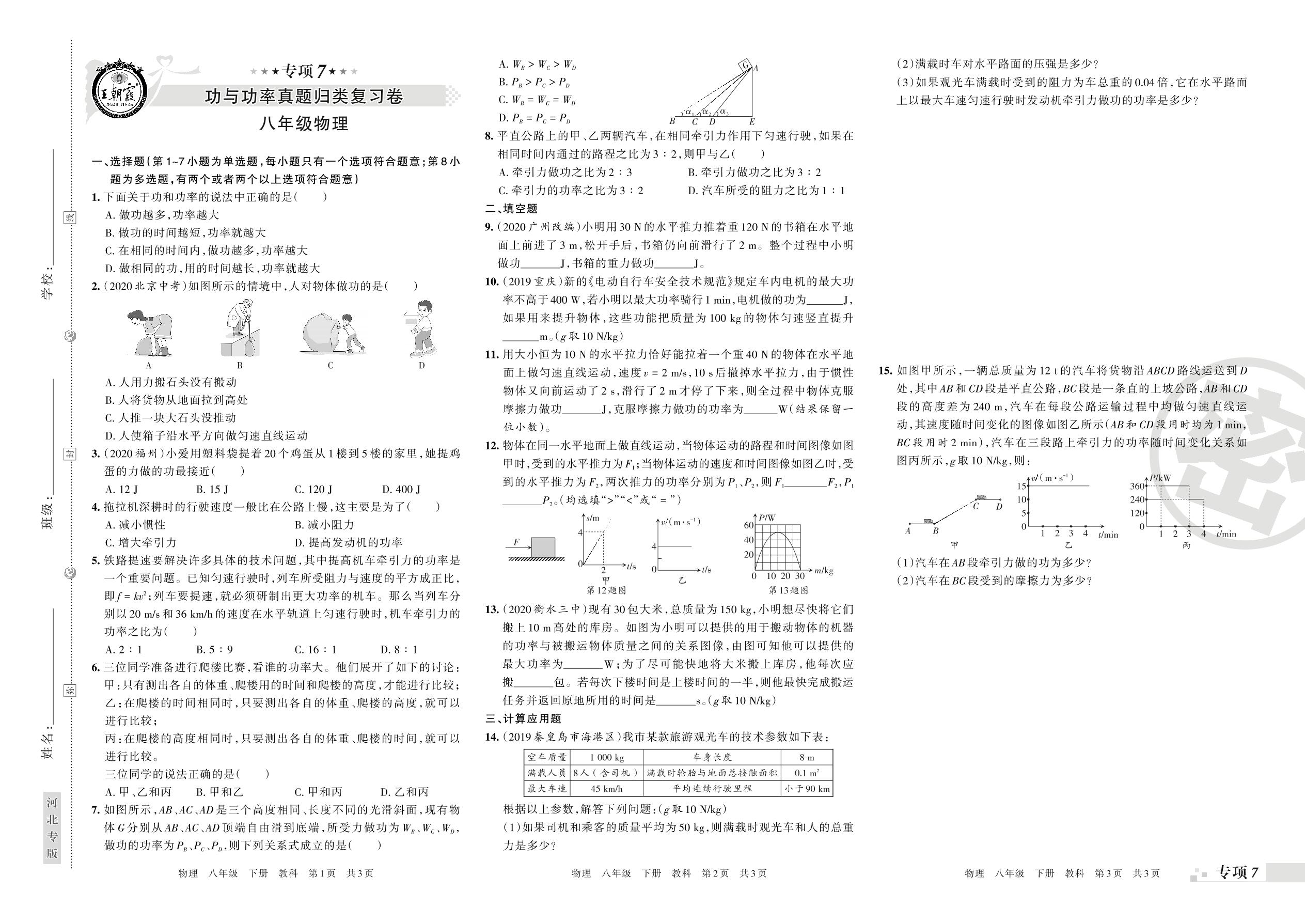 王朝霞期末专项卷——功与功率、机械效率与机械能真题归类复习八年级下册物理(教科版)【0】