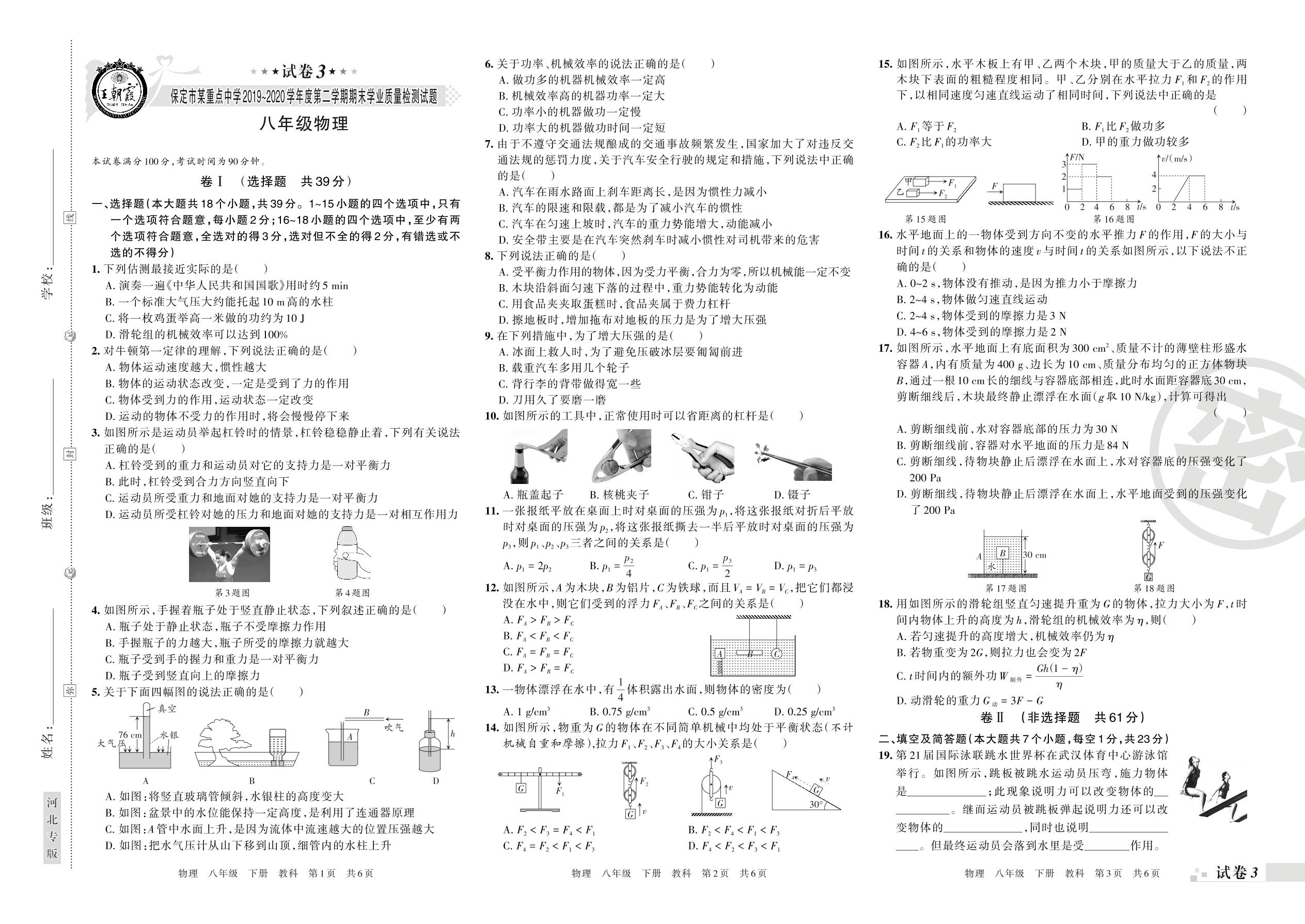 2019-2020学年第二学期保定市八年级物理试卷(教科版)【3】