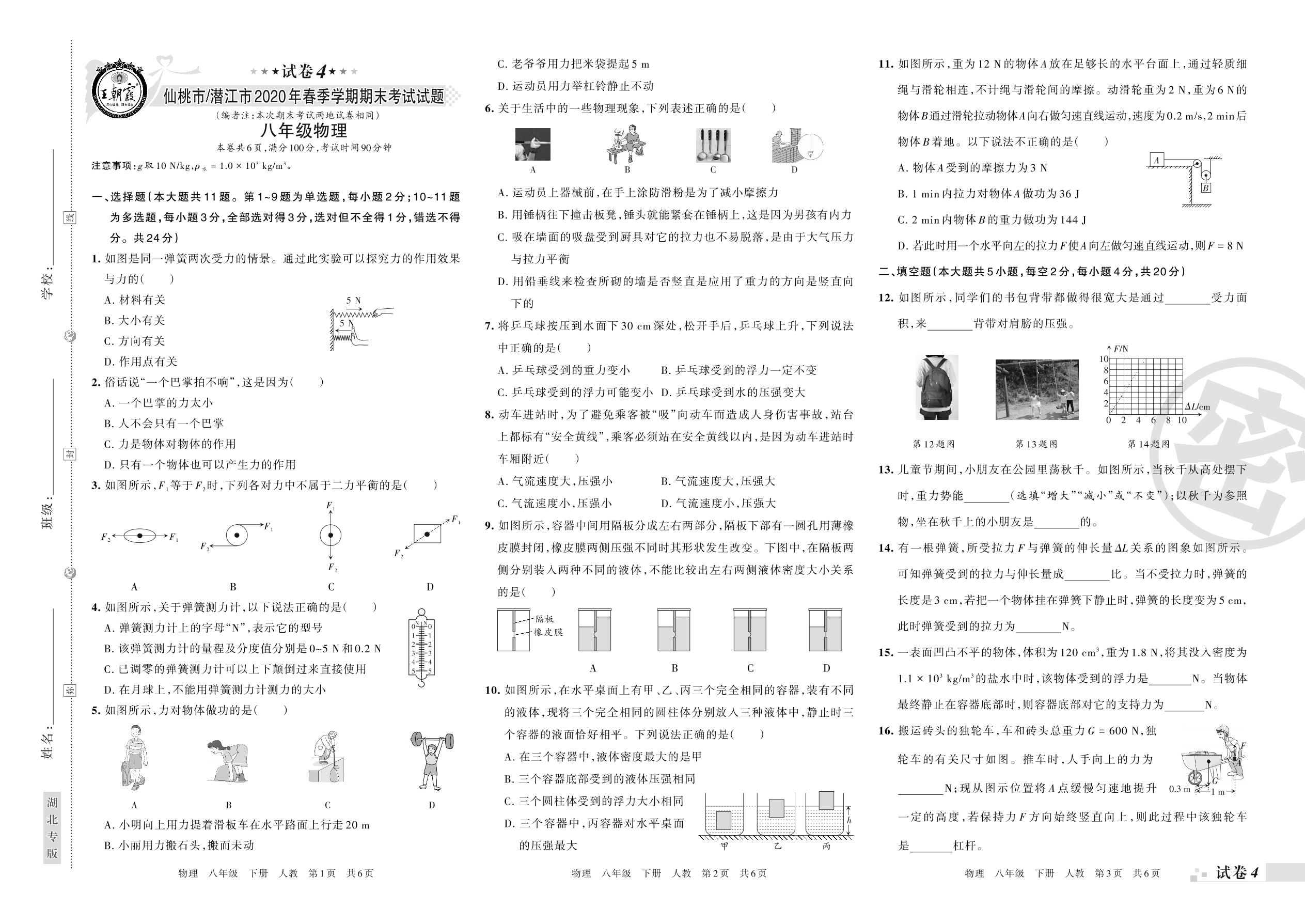 2019-2020学年第二学期仙桃市、潜江市八年级物理试卷(人教版)【4】