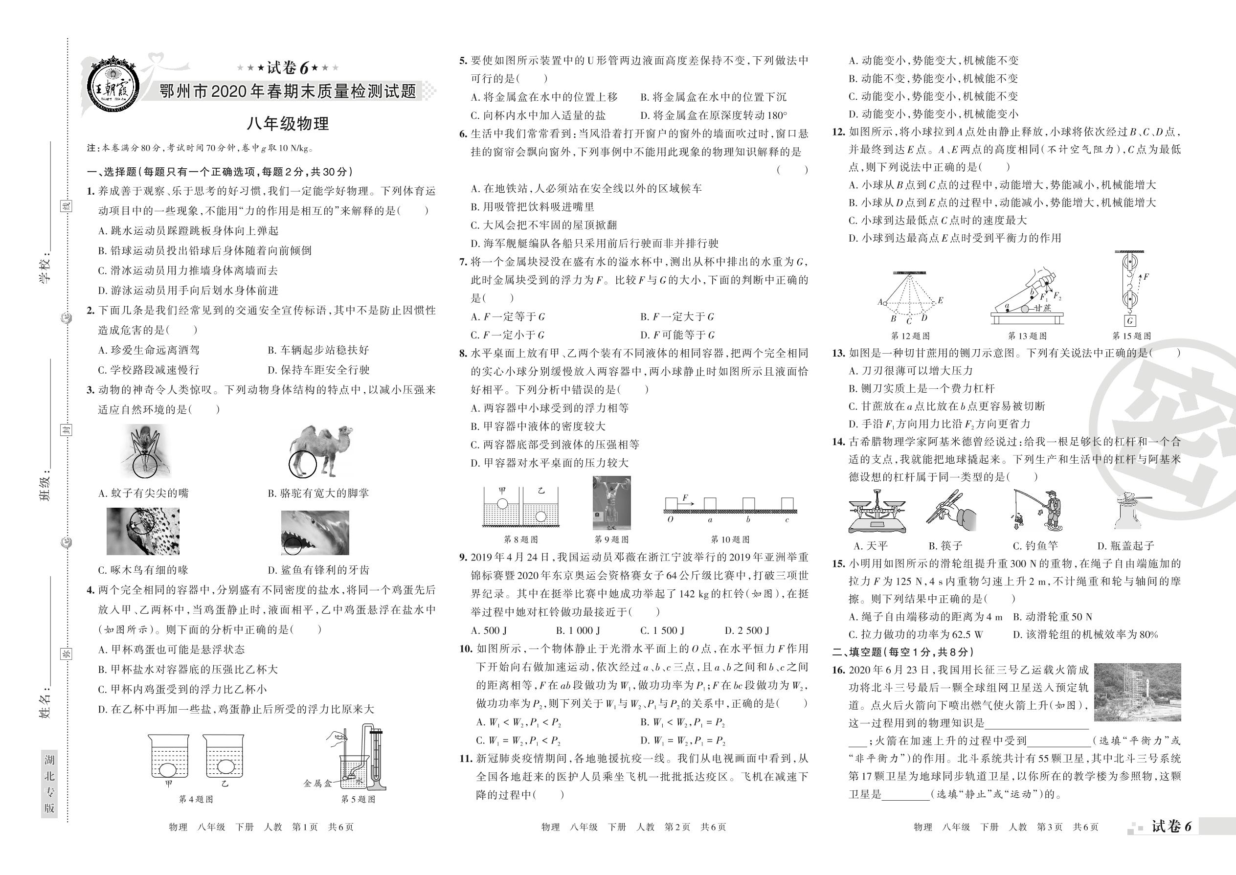 2019-2020学年第二学期鄂州市八年级物理试卷(人教版)【6】