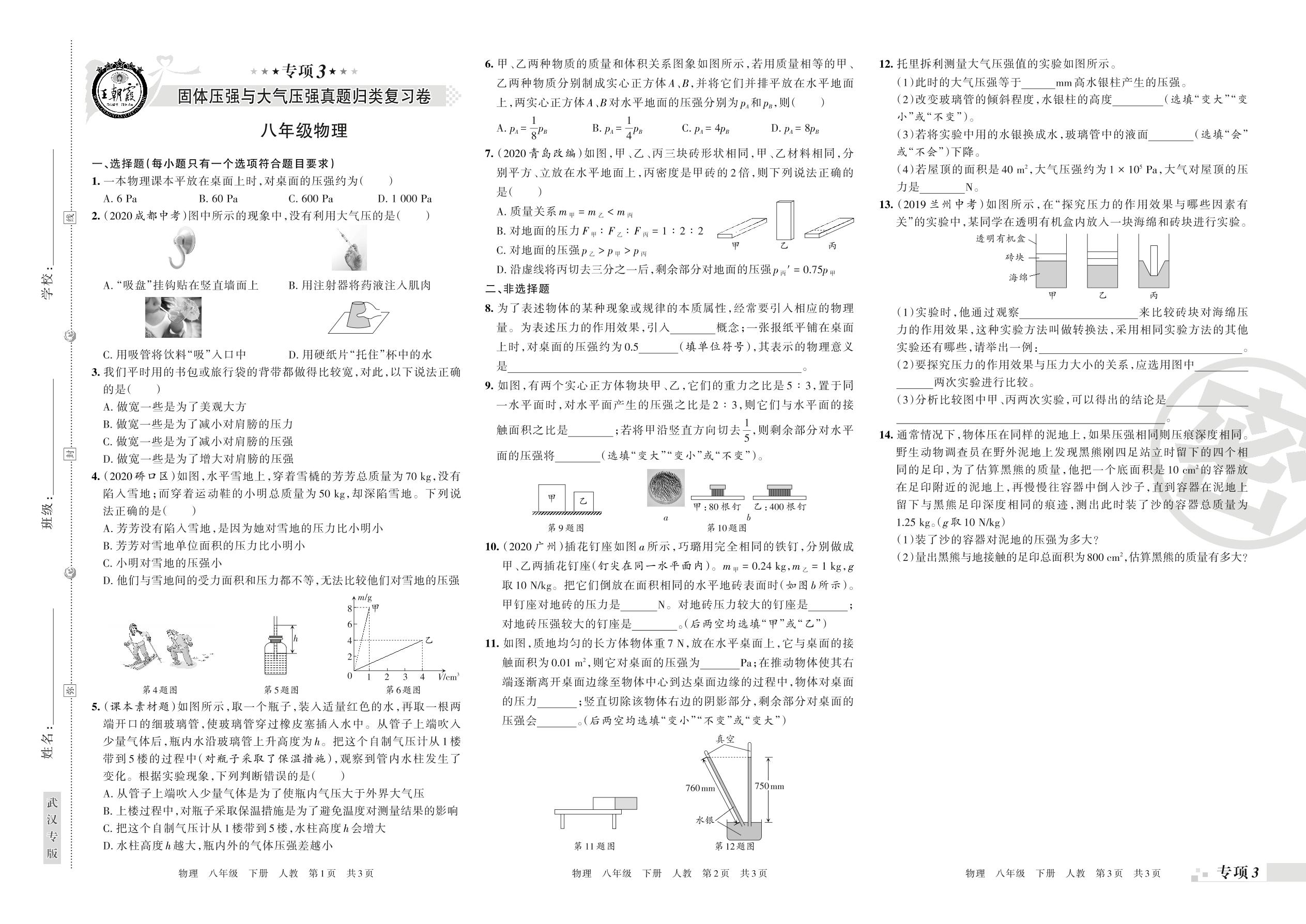 王朝霞期末专项卷——固体压强与大气压器、液体压强真题归类复习八年级下册物理(人教版)【0】