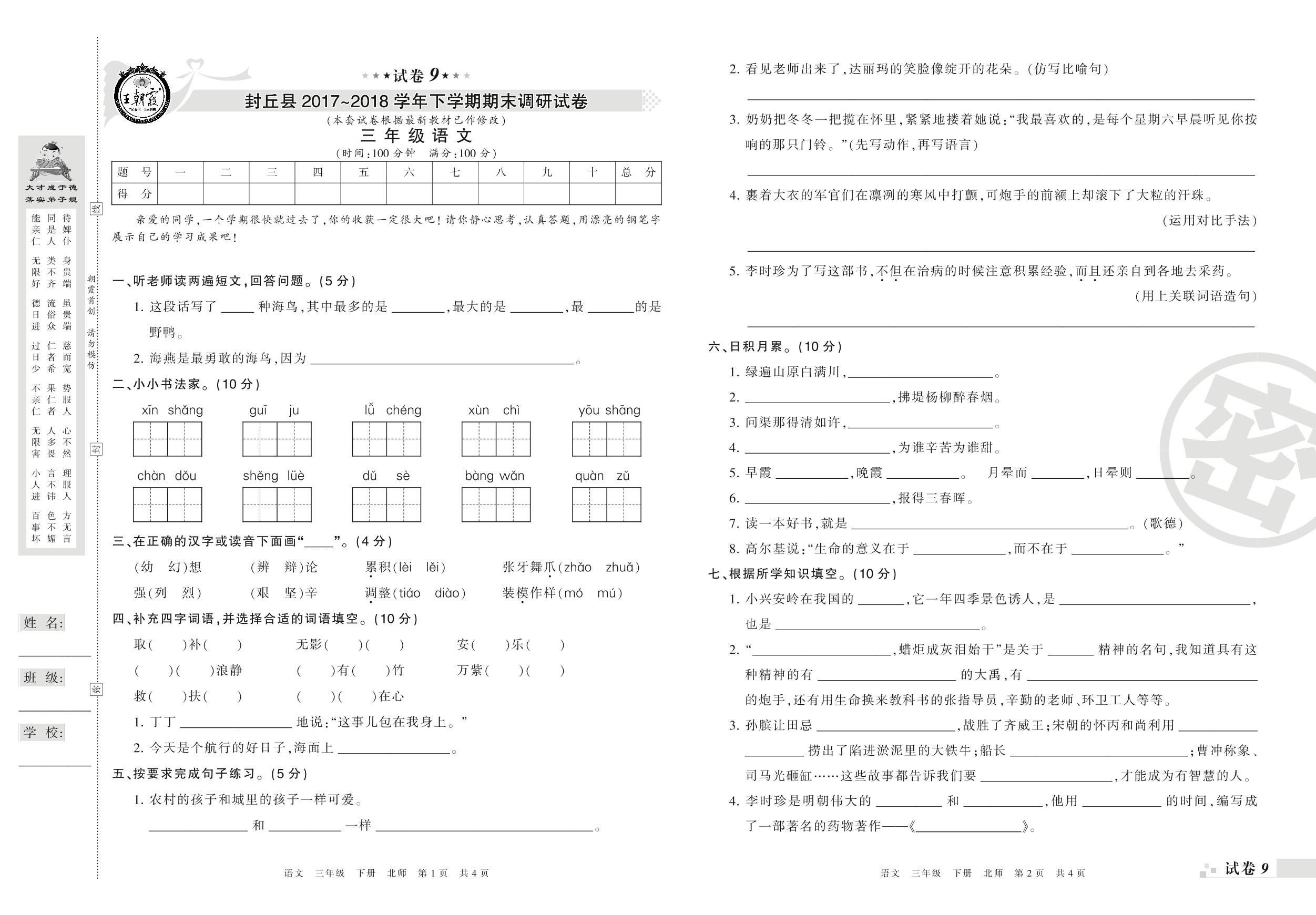 2017-2018学年第二学期新乡市封丘县三年级语文试卷(北师版)【9】