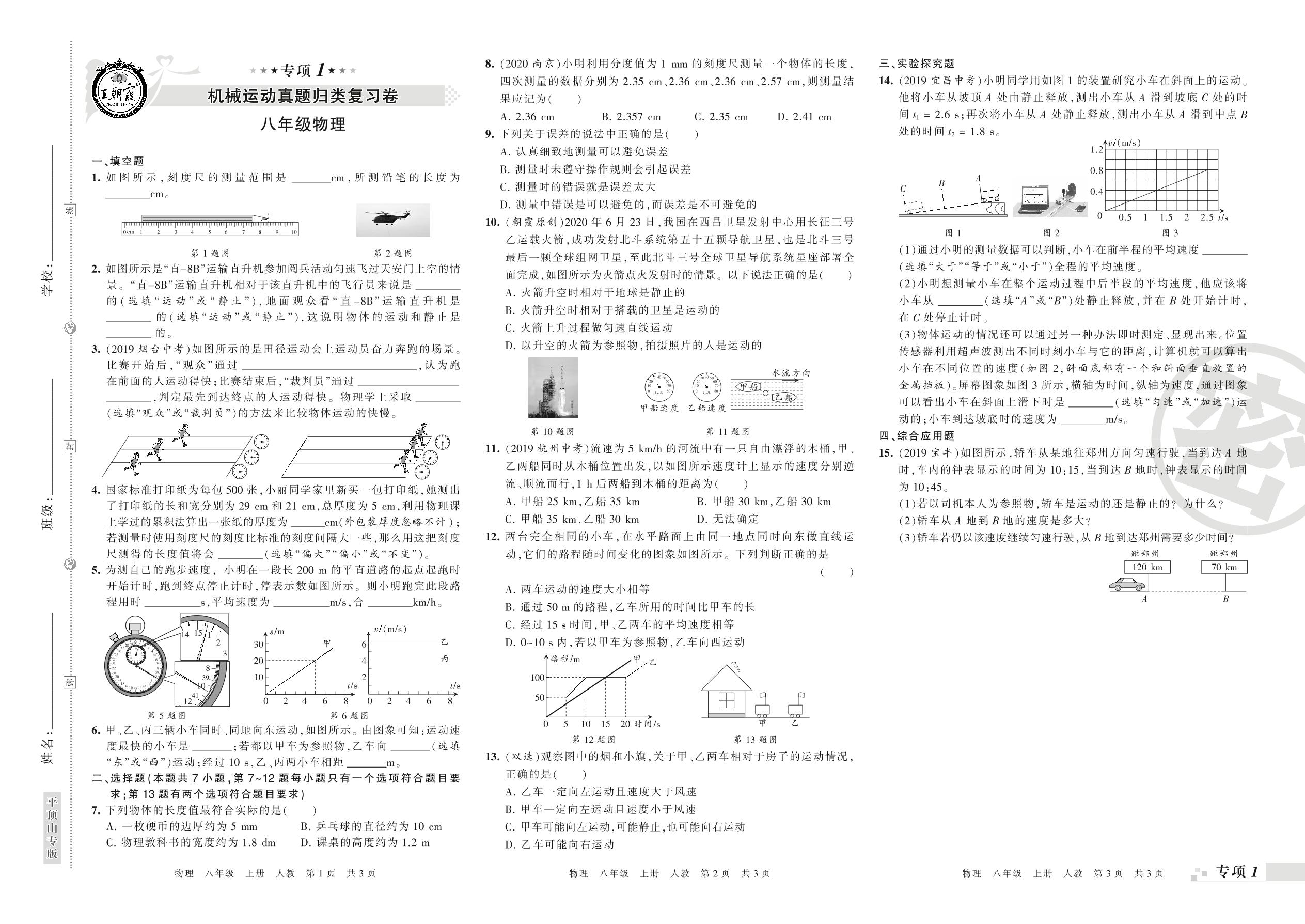 王朝霞期末专项卷——机械运动、声现象真题归类复习八年级上册物理(人教版)