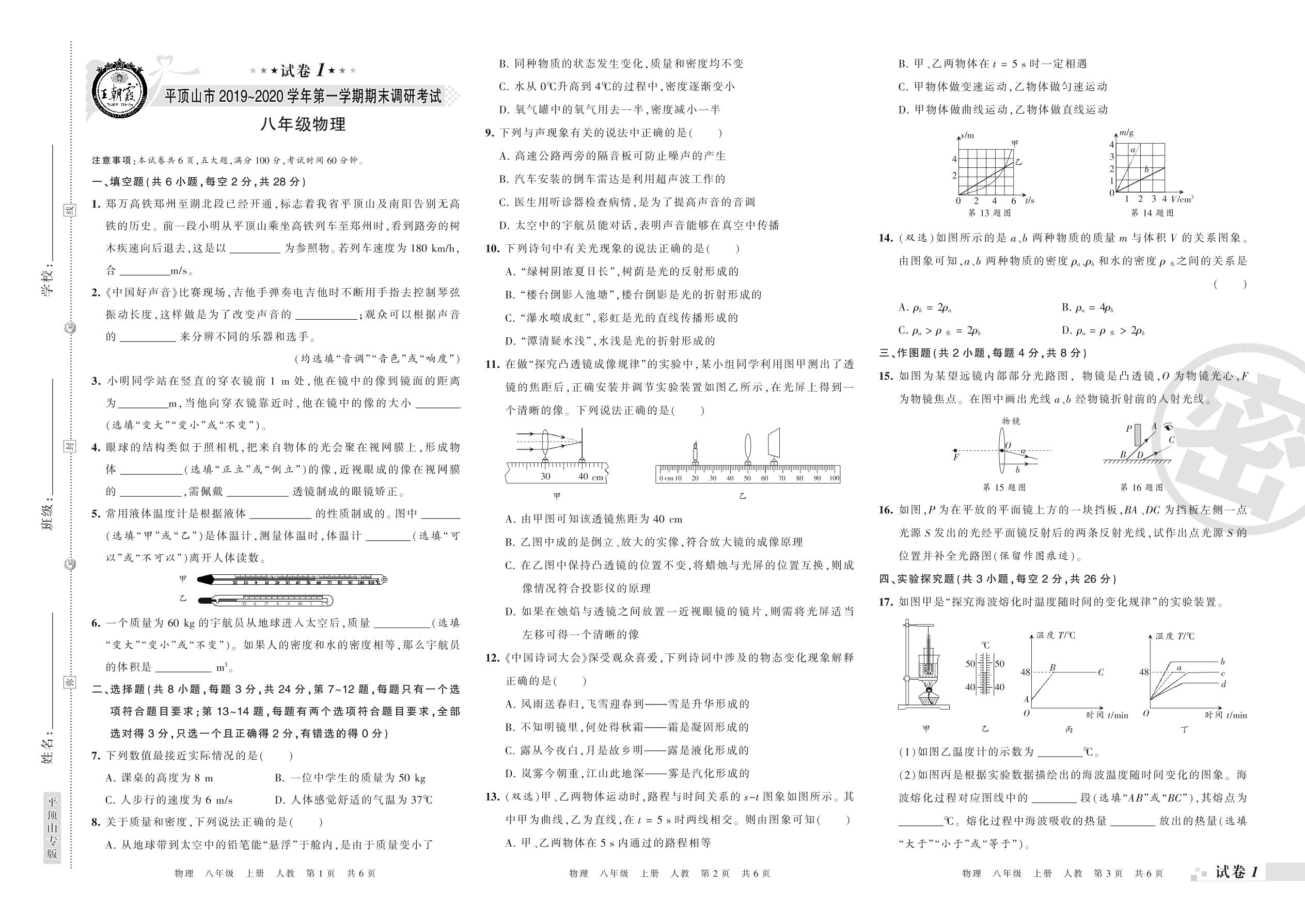 2019-2020学年第一学期平顶山市八年级物理试卷(人教版)【1】