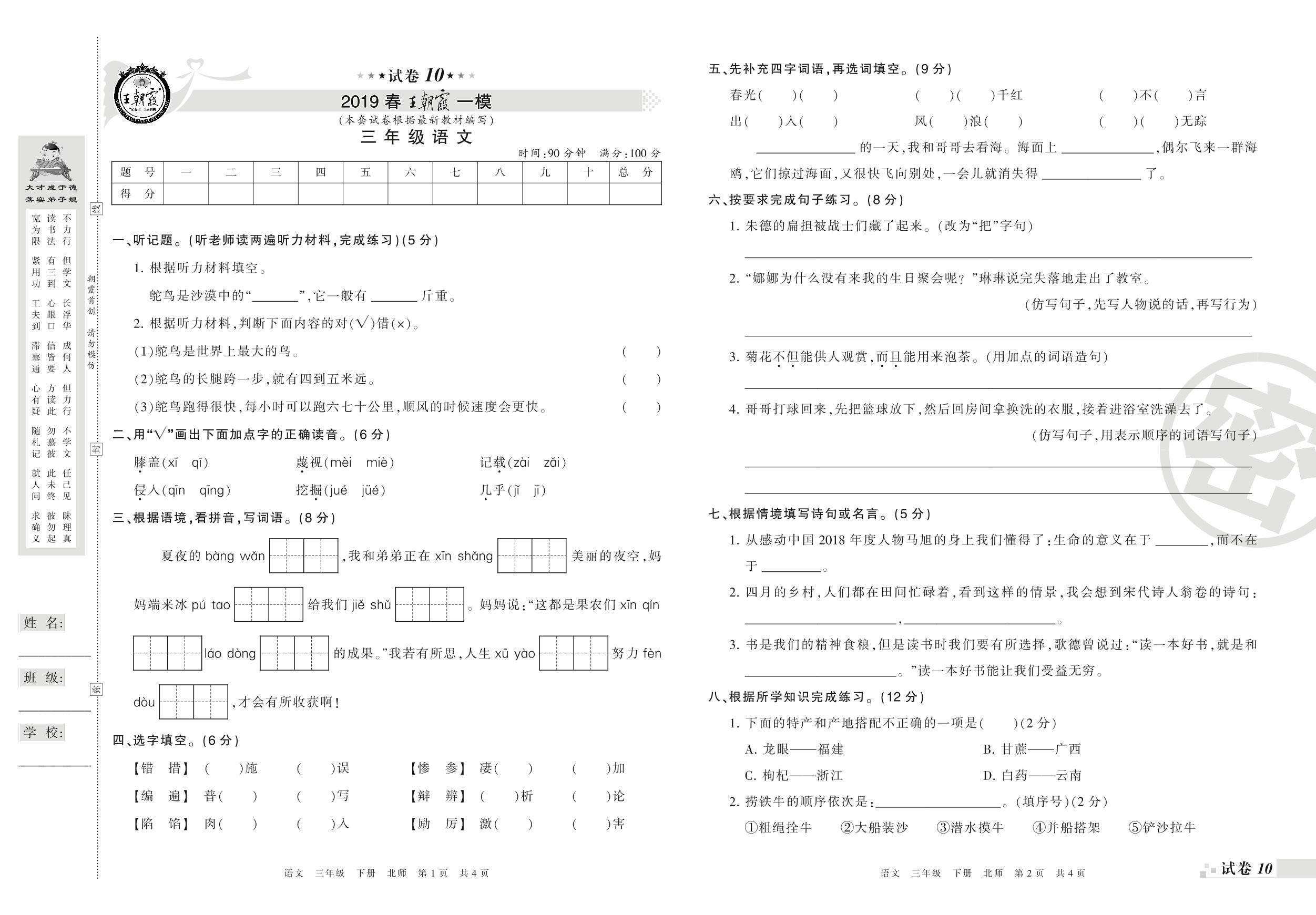 王朝霞期末模拟卷三年级下册语文(北师版)【10】