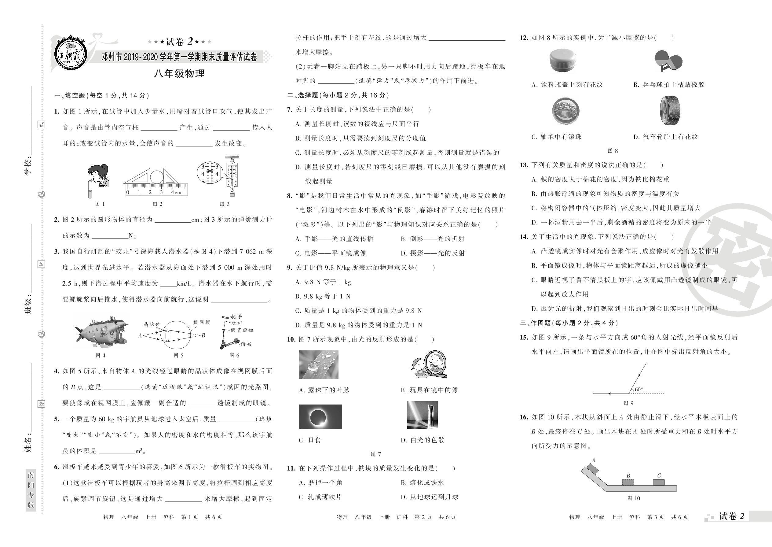 2019-2020学年第一学期邓州市八年级物理试卷(沪科版)【2】