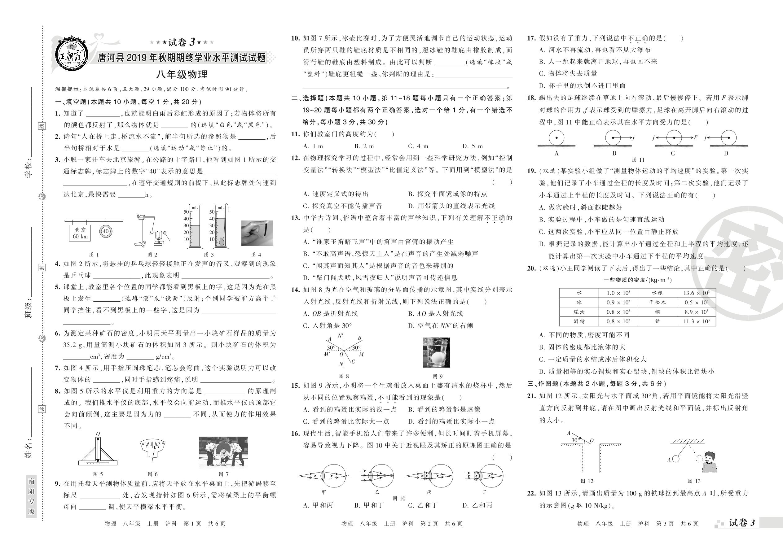 2019-2020学年第一学期南阳市唐河县八年级物理试卷(沪科版)【3】