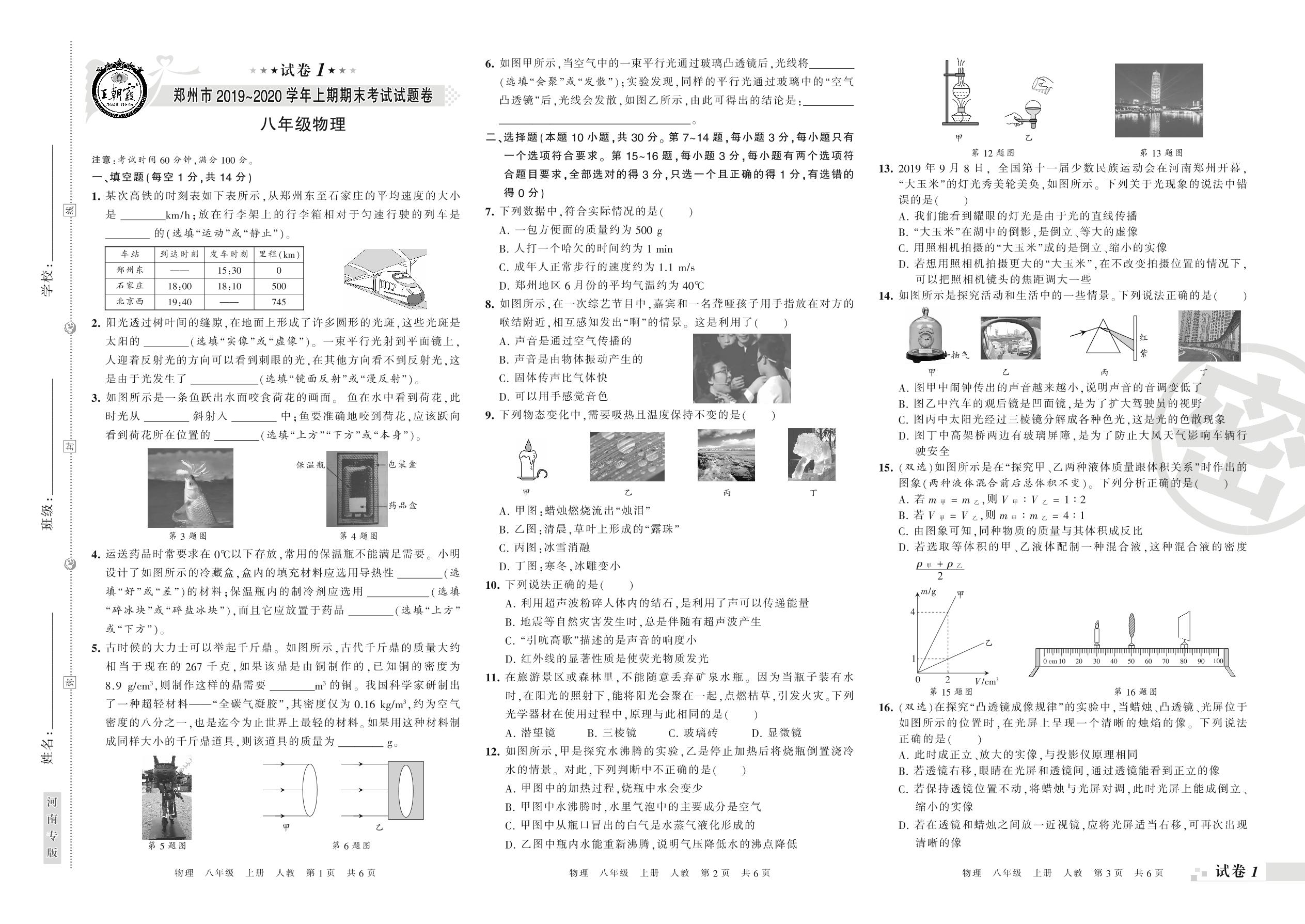2019-2020学年第一学期郑州市八年级物理试卷(人教版)【1】
