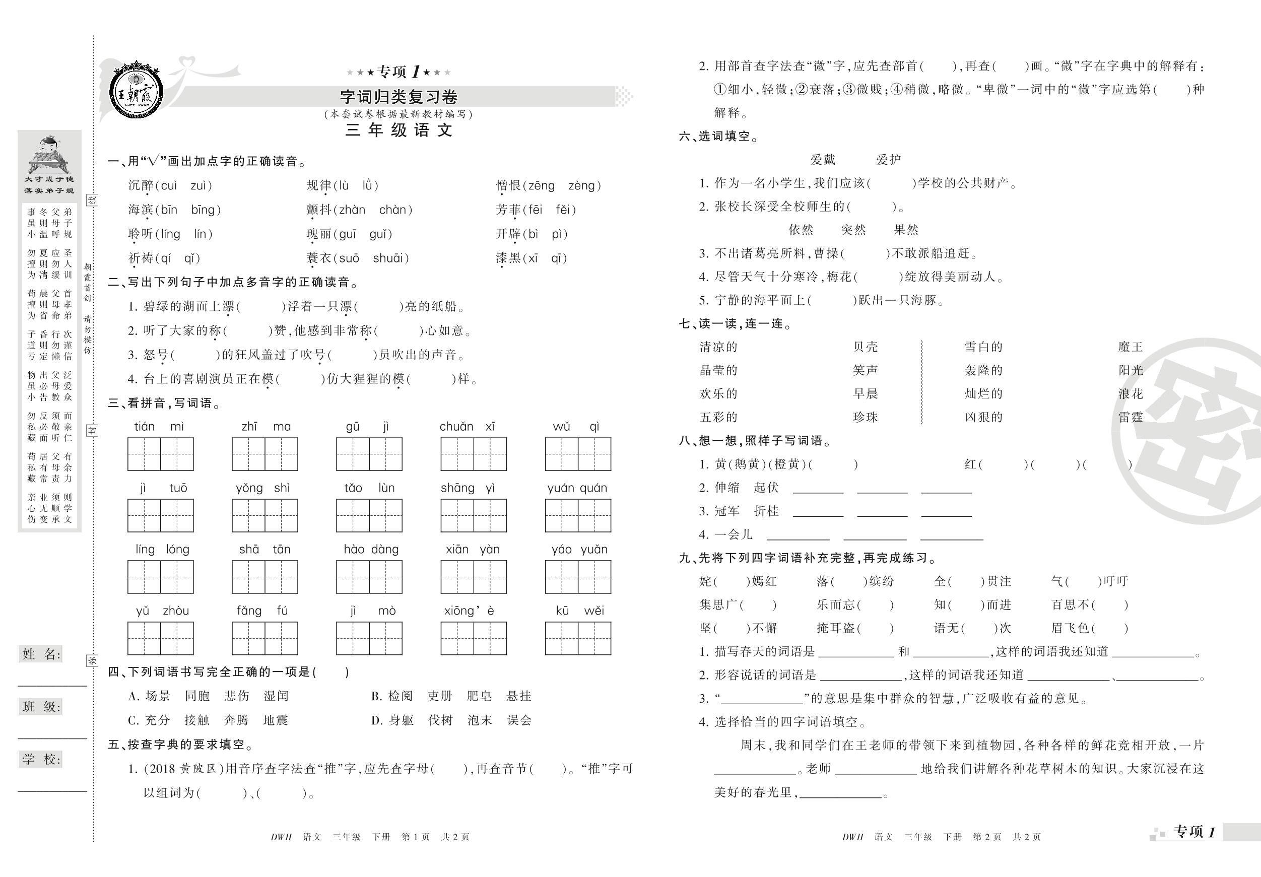 王朝霞期末专项卷——字词、句子归类复习三年级下册语文(鄂教版)【0】