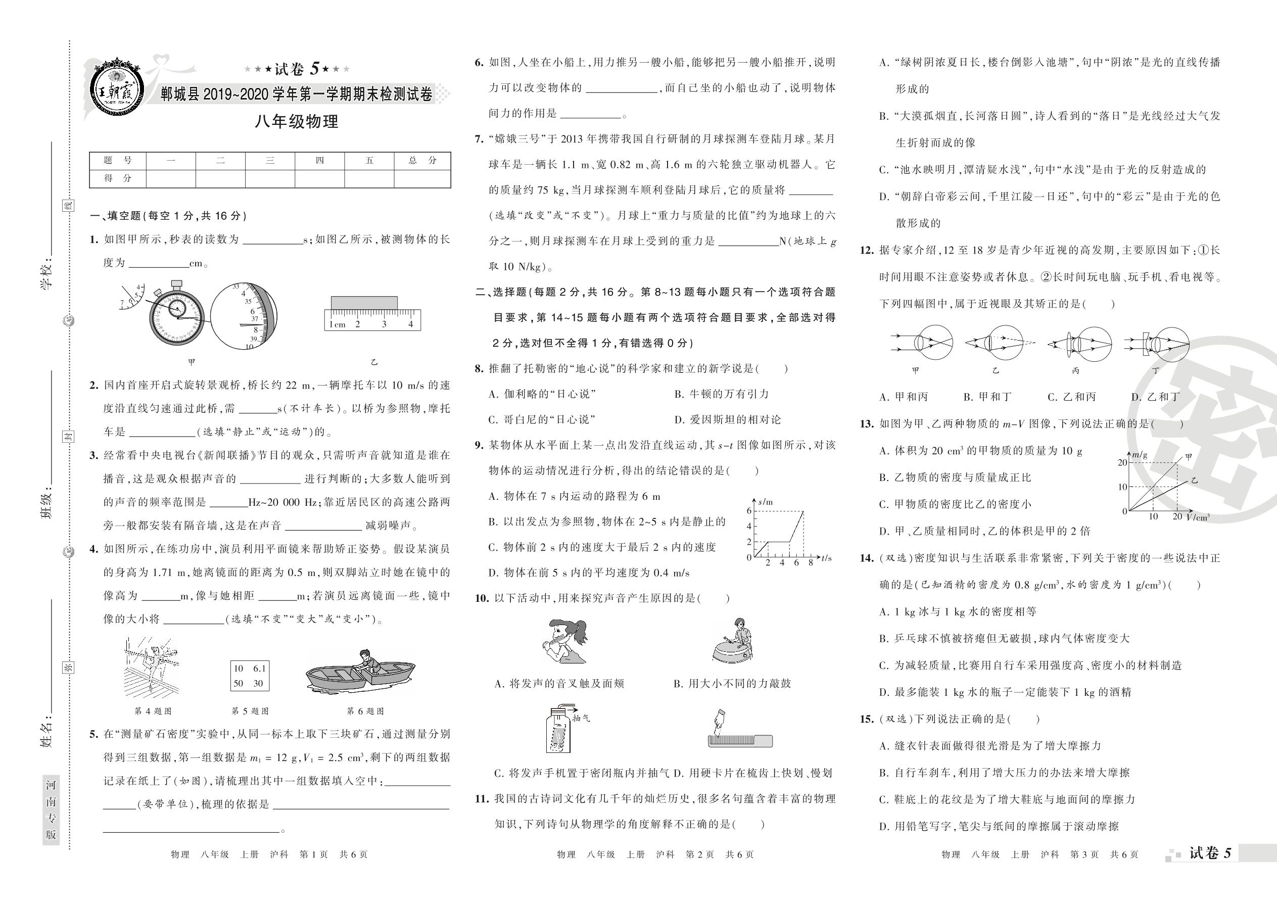 2019-2020学年第一学期周口市郸城县八年级物理试卷(沪科版)【5】
