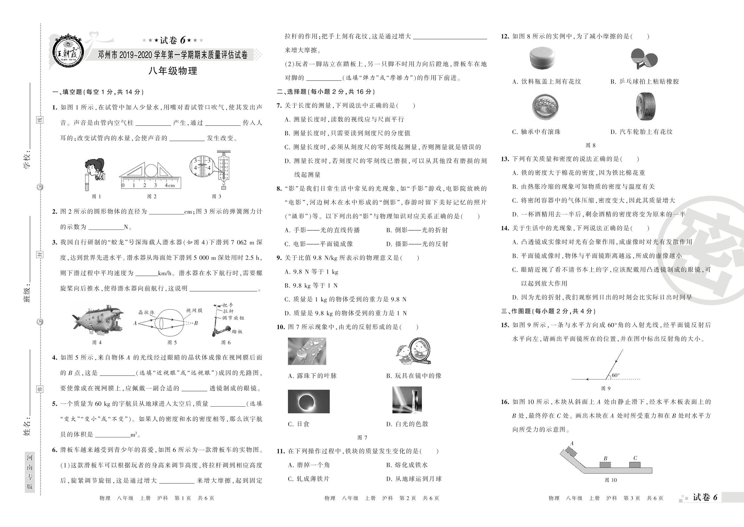 2019-2020学年第一学期邓州市八年级物理试卷(沪科版)【6】