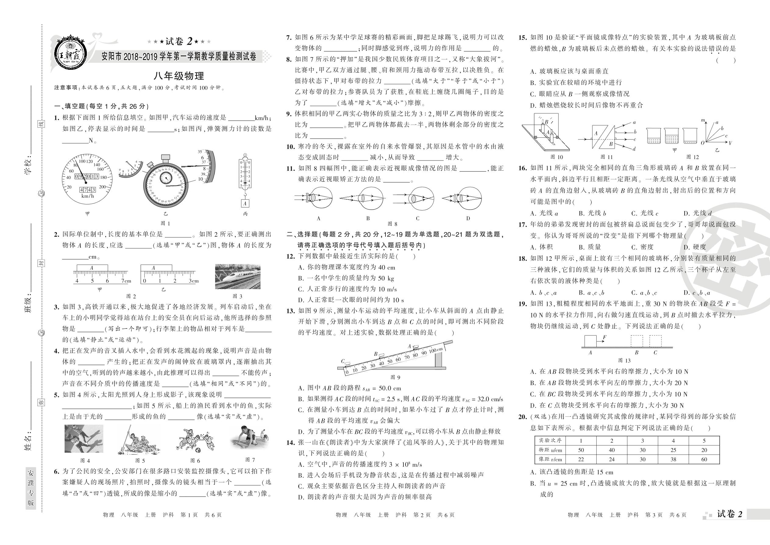 2018-2019学年第一学期安阳市八年级物理试卷(沪科版)【2】