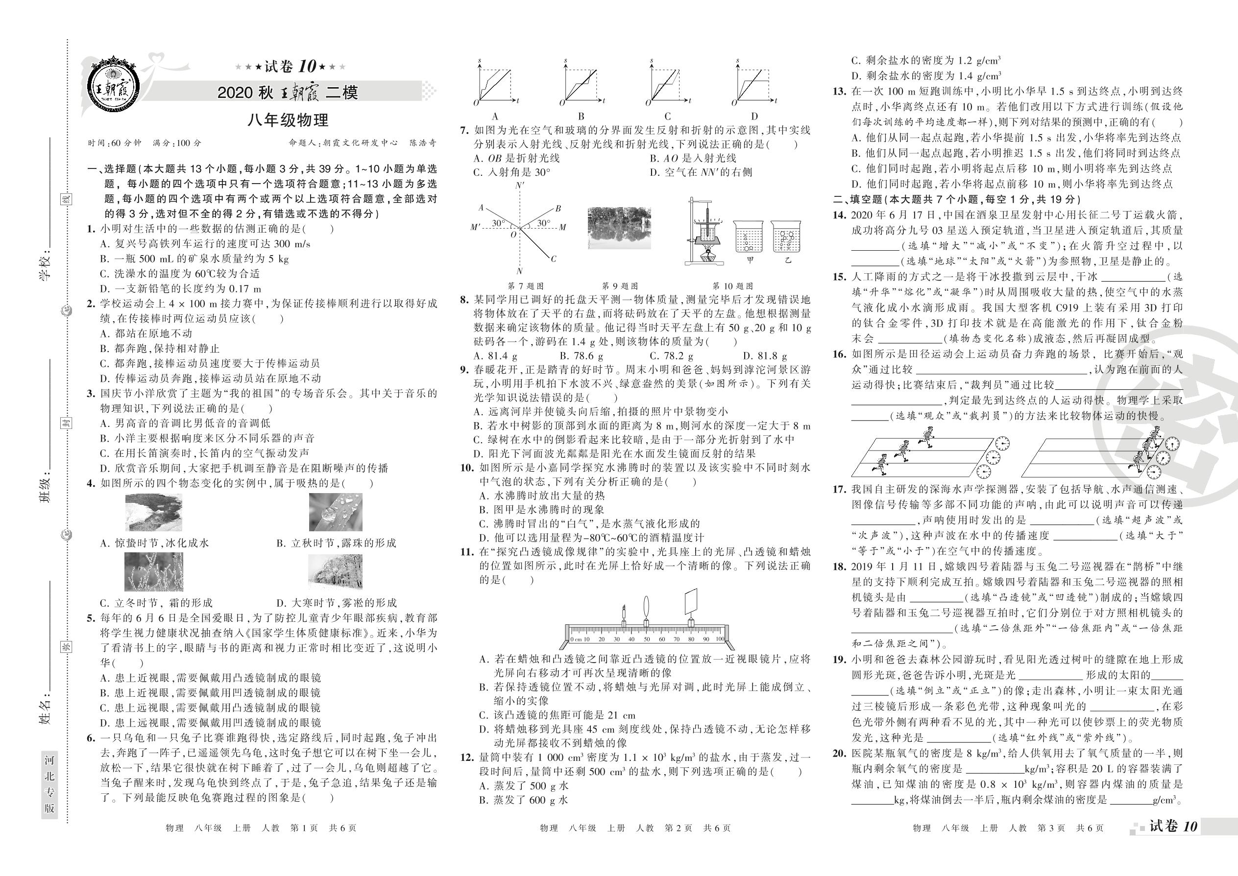 王朝霞期末模拟卷八年级上册物理(人教版)【10】