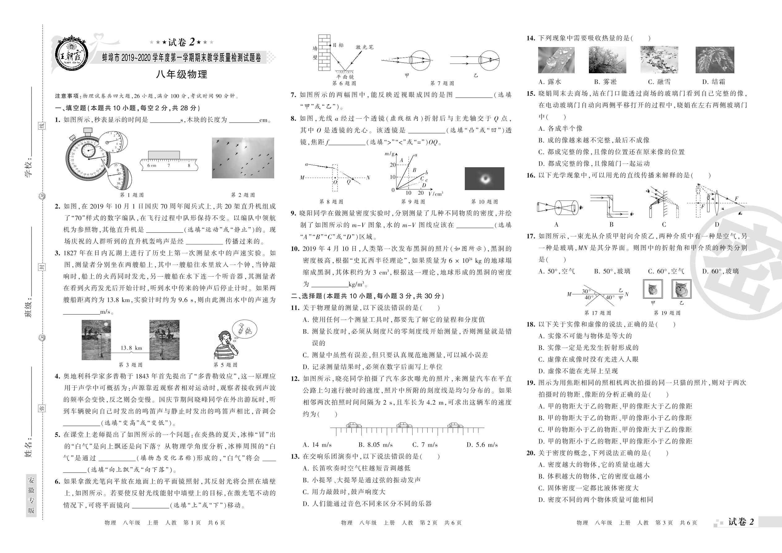 2019-2020学年第一学期蚌埠市八年级物理试卷(人教版)【2】