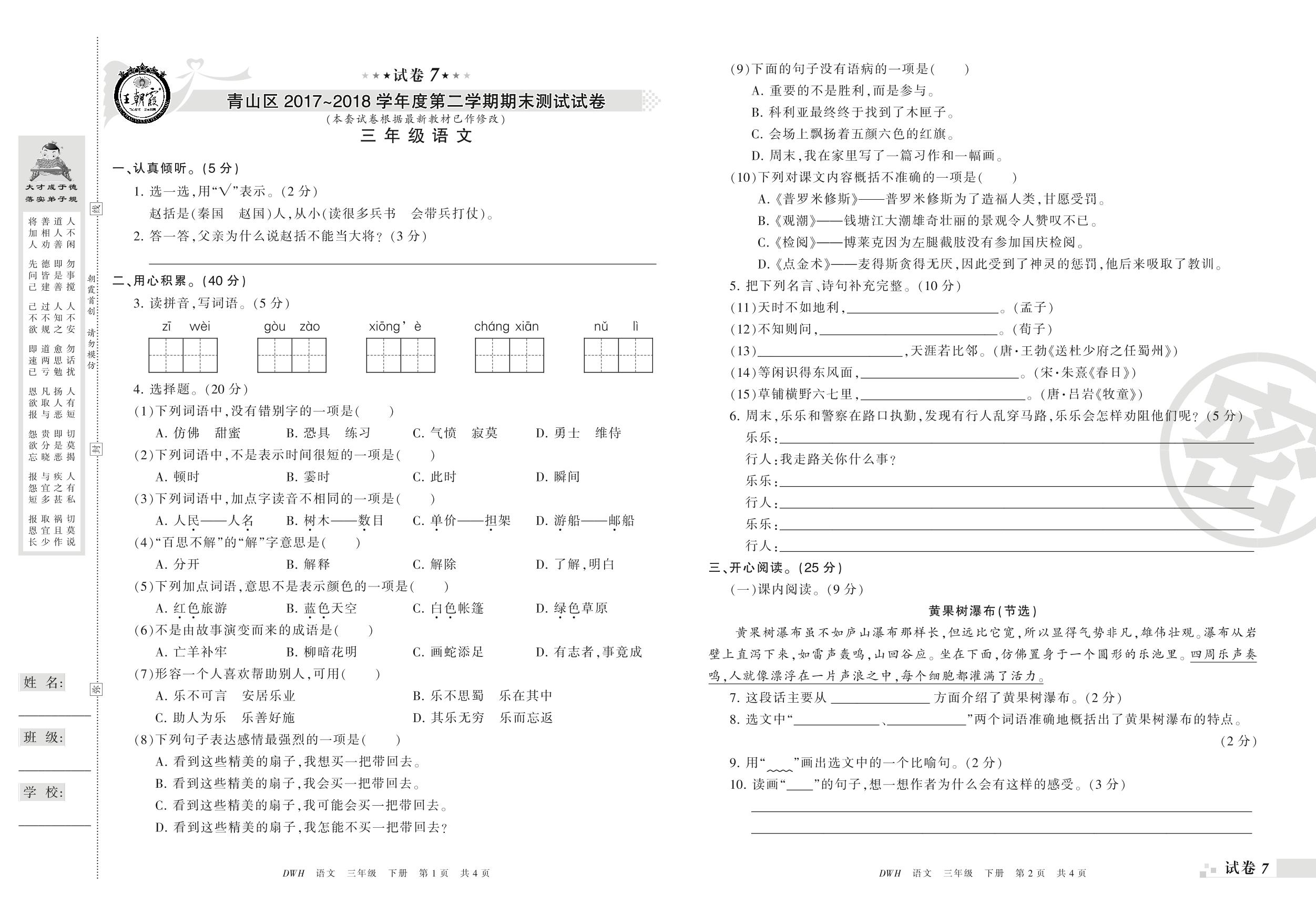 2017-2018学年第二学期武汉市青山区三年级语文试卷(鄂教版)【7】