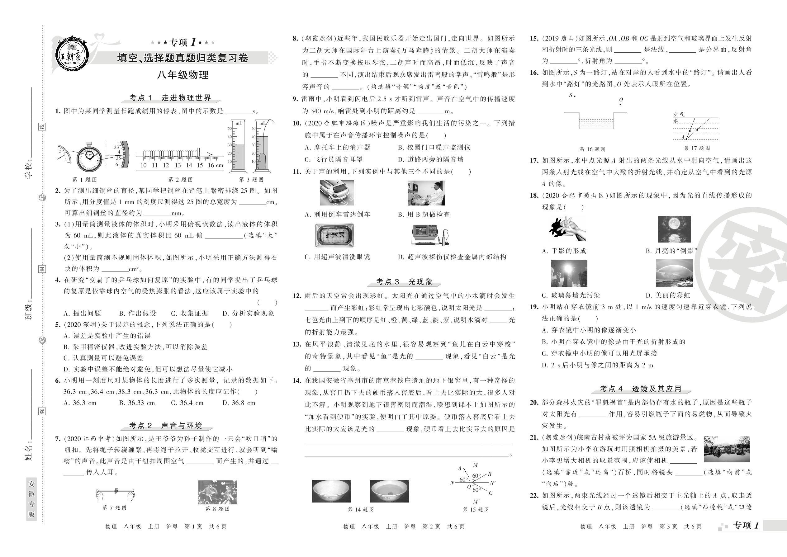 王朝霞期末专项卷——填空、选择题真题归类复习八年级上册物理(沪粤版)