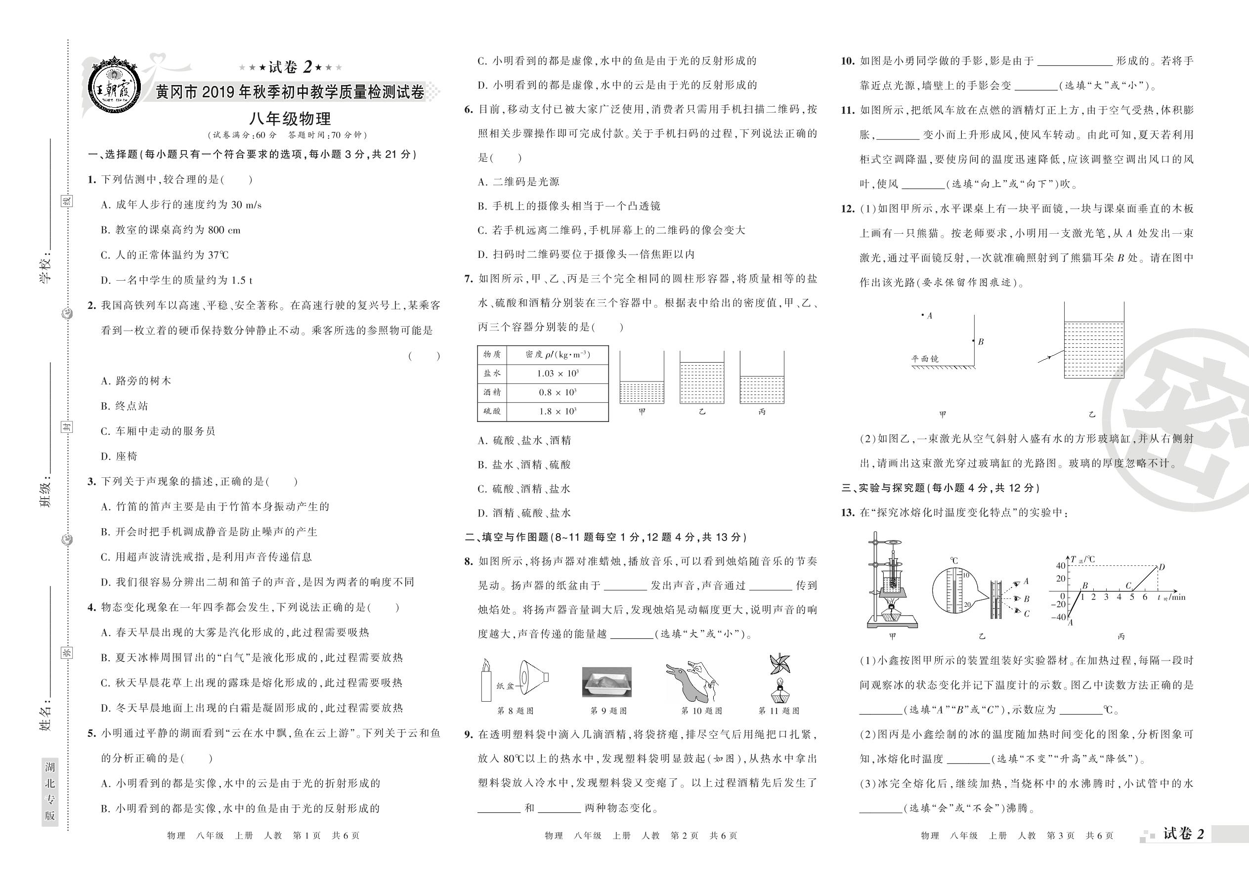 2019-2020学年第一学期黄冈市八年级物理试卷(人教版)【2】