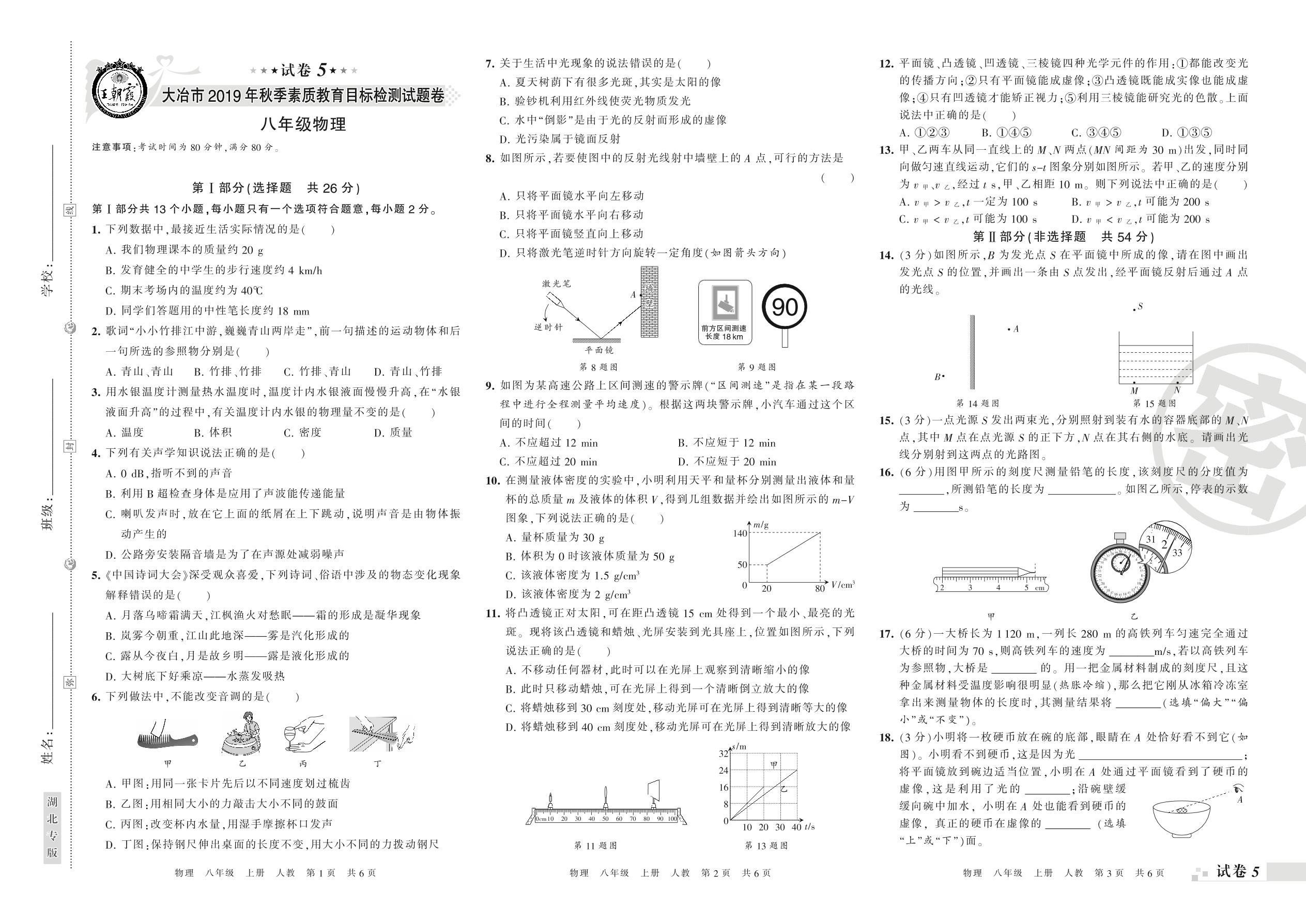 2019-2020学年第一学期大冶市八年级物理试卷(人教版)【5】
