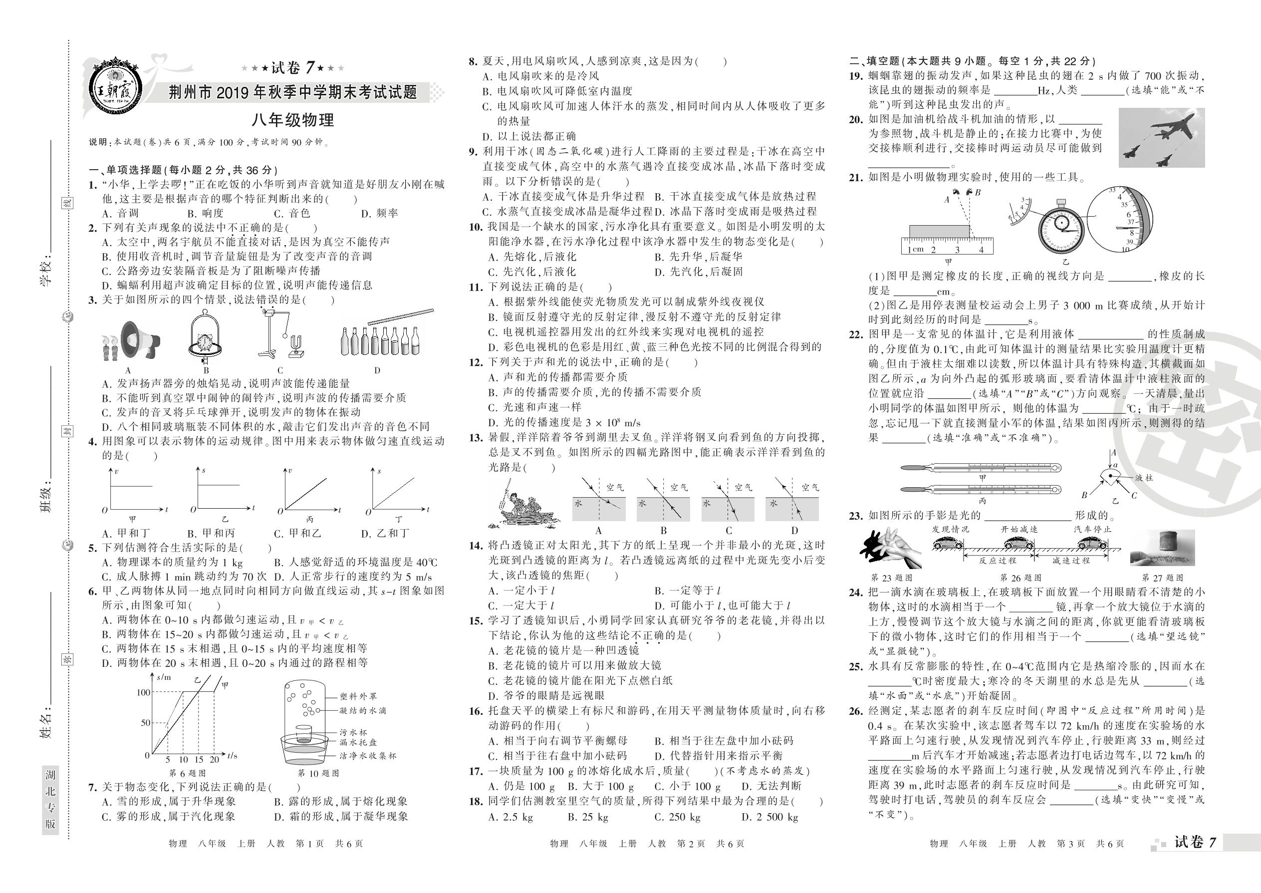 2019-2020学年第一学期荆州市八年级物理试卷(人教版)【7】