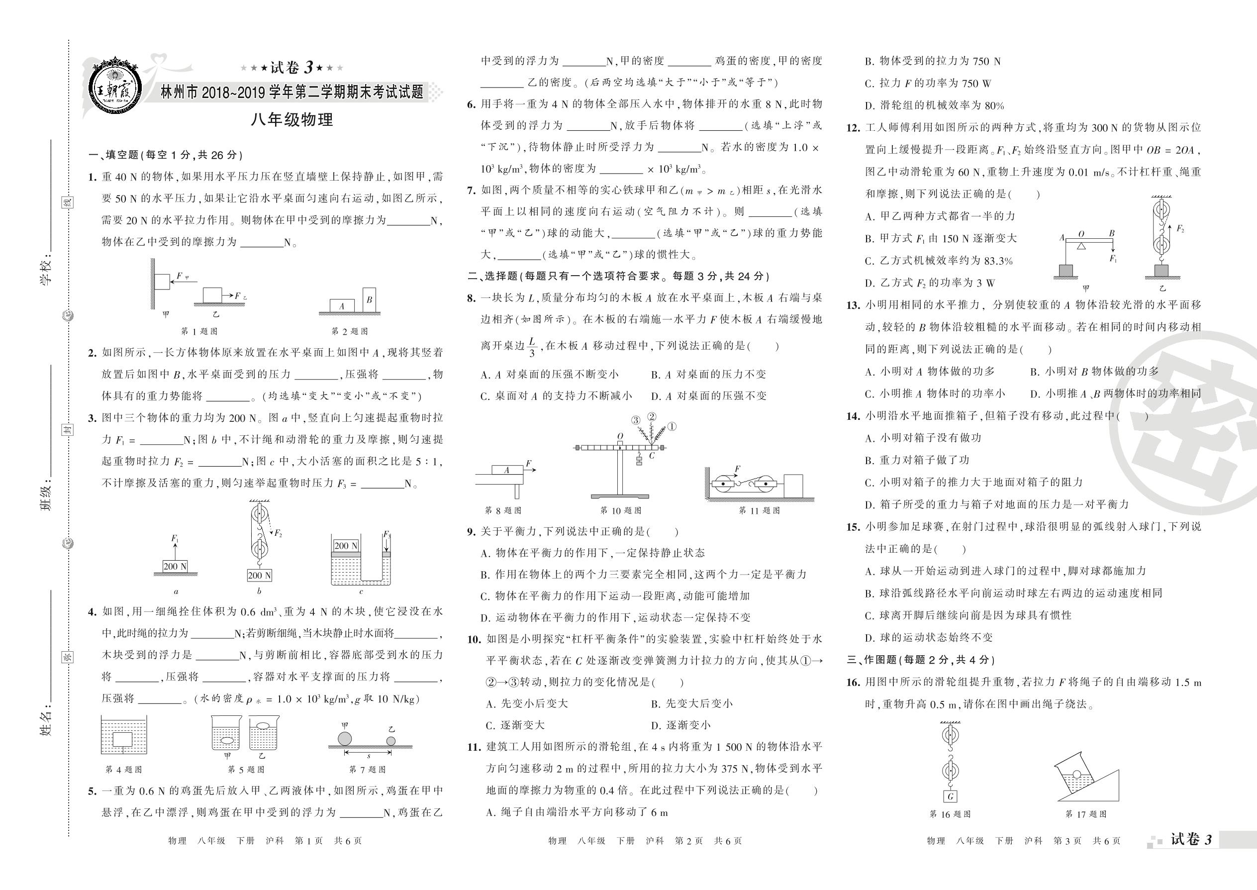 2018-2019学年第二学期林州市八年级物理试卷(沪科版)【3】