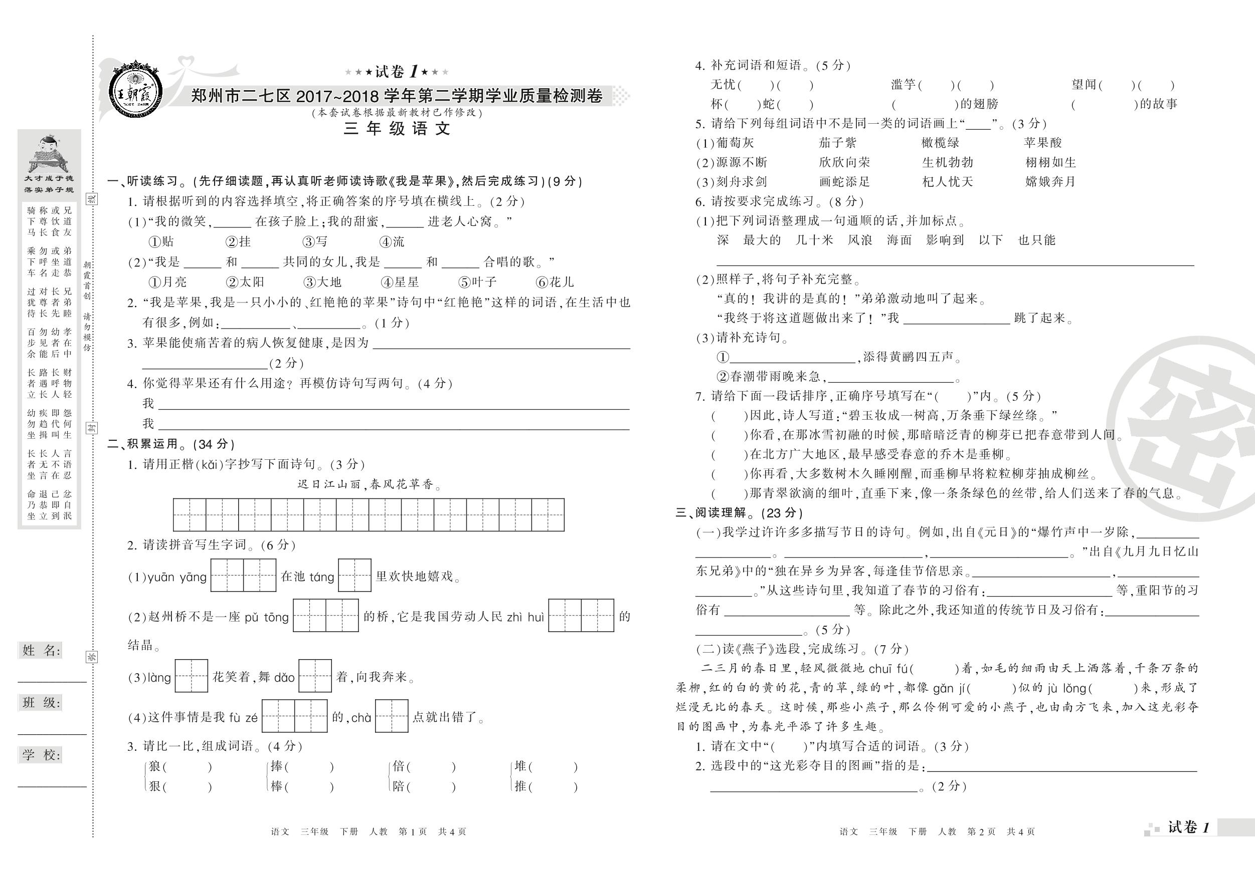 2017-2018学年第二学期郑州市二七区三年级语文试卷(人教版)【1】